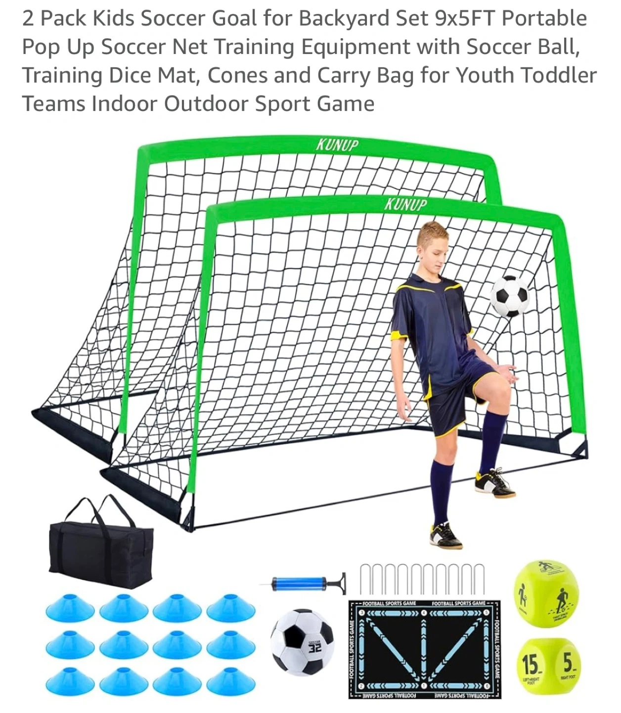 2 Pack Kids Soccer Goal for Backyard Set 9x5FT Portable Pop Up Soccer Net Training Equipment with Soccer Ball, Training Dice Mat, Cones and Carry Bag for Youth Toddler Teams Indoor Outdoor Sport Game