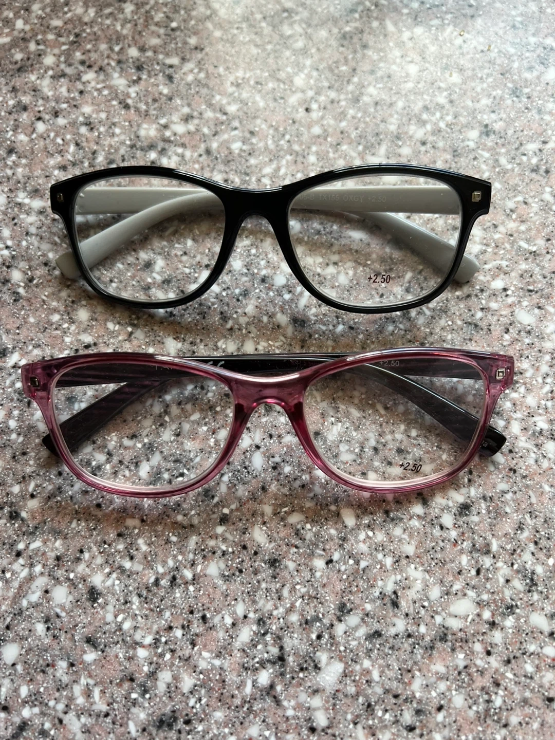 Selling two pairs of reading glasses. One pair has a black frame & gray arms and the other has a pink frame & black arms. Both are +2.50 magnification. π