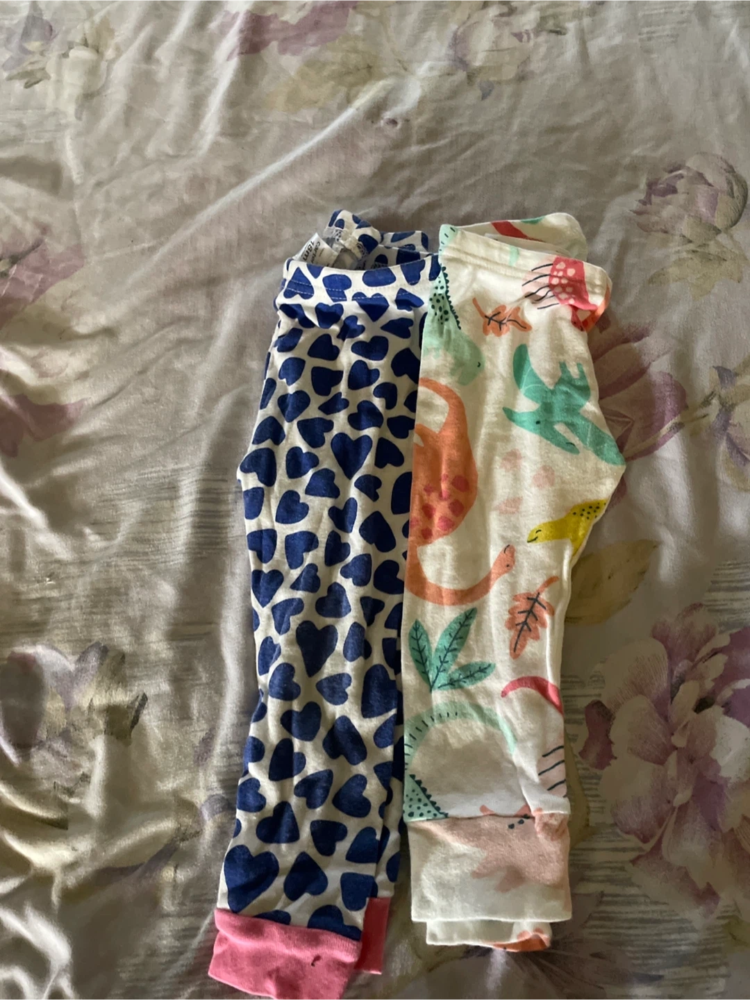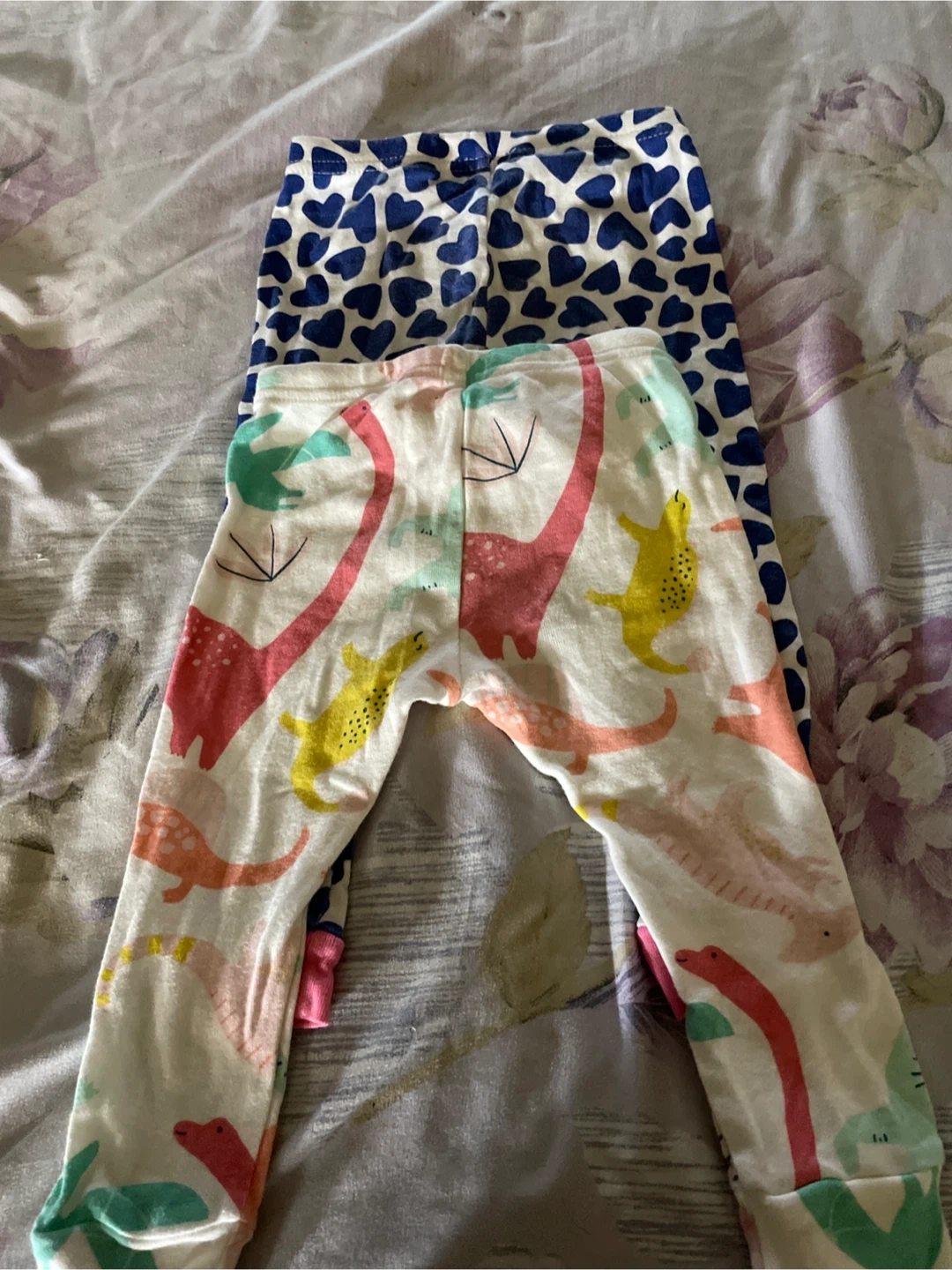 Two pairs of baby girl leggings. One is white with a colorful dinosaur print and the other is navy with blue hearts. They are in good used condition and ready for a new home!