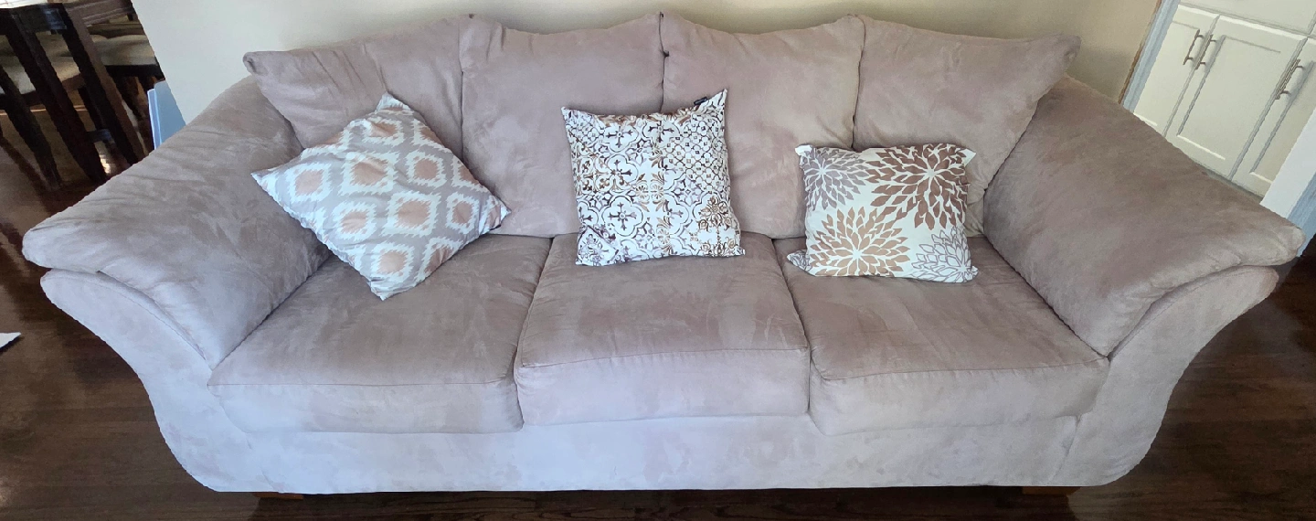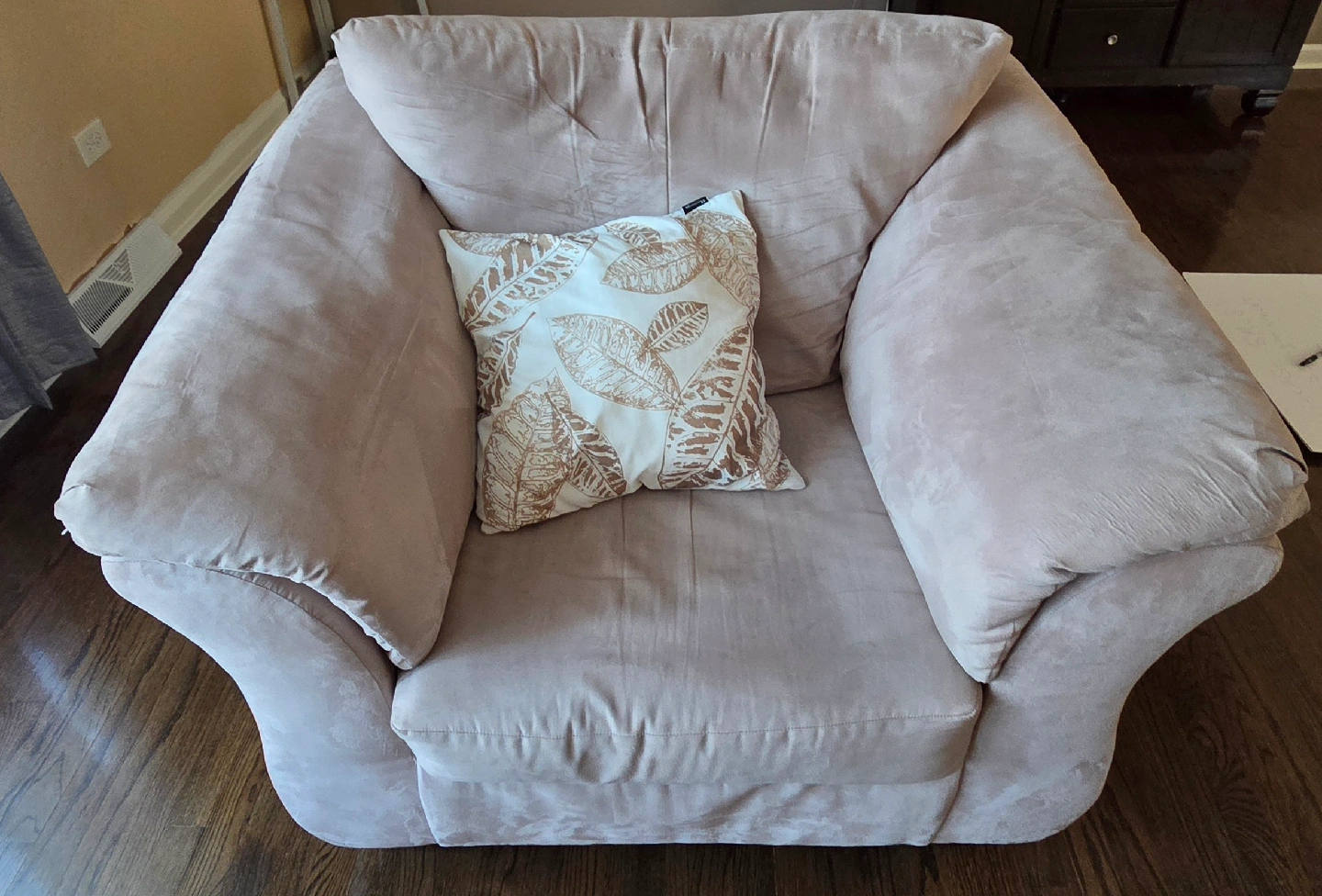 Selling a comfy armchair and Sectional with pillows in a light beige color! It's in good condition and perfect for a cozy reading nook or living room addition. The material is soft and inviting, making it a great spot to relax after a long day