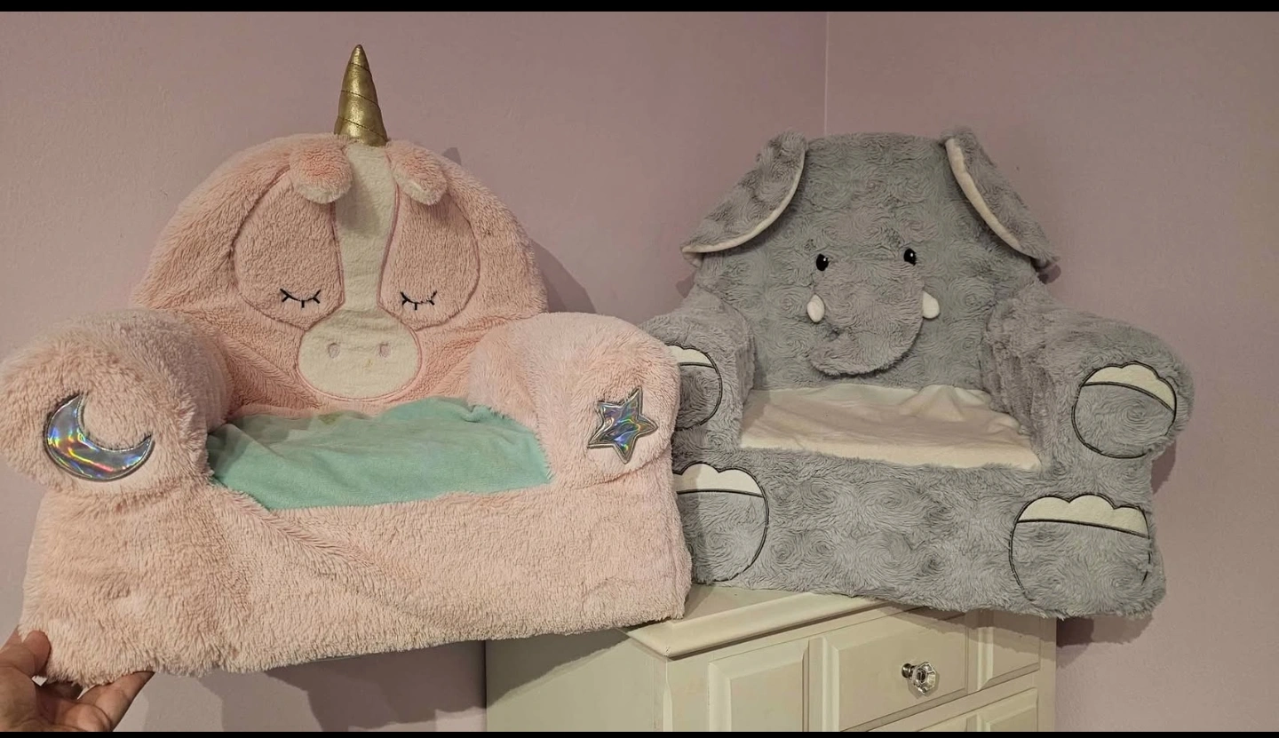 97In really good condition! 2 stuffed animal toddler chairs. 1 unicorn and 1 elephant. Asking $15 for both! Or best offer!