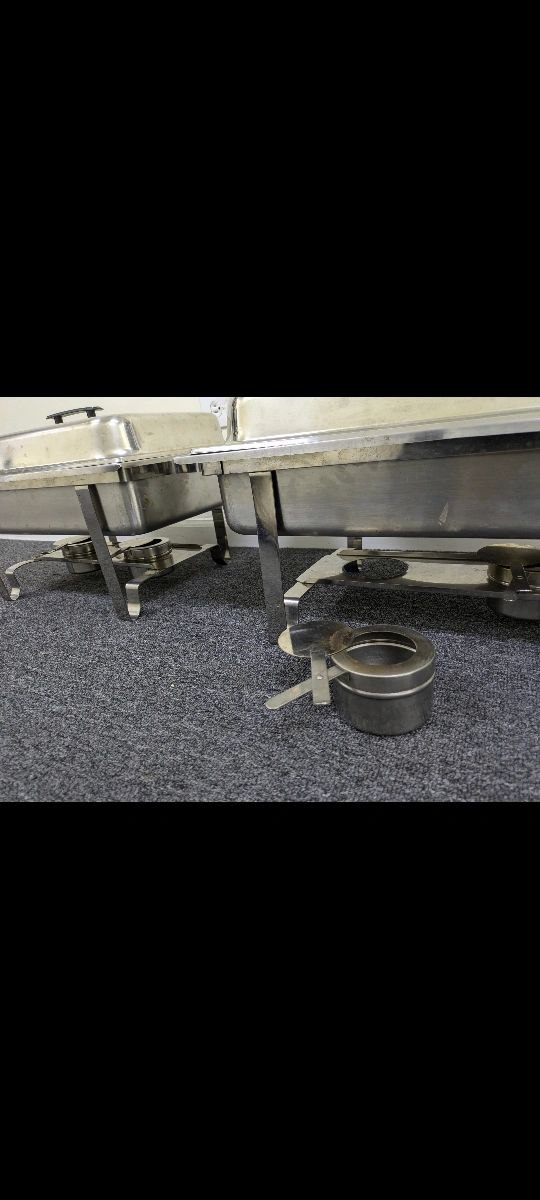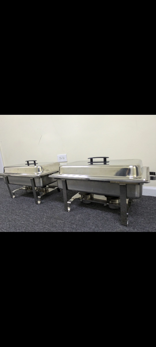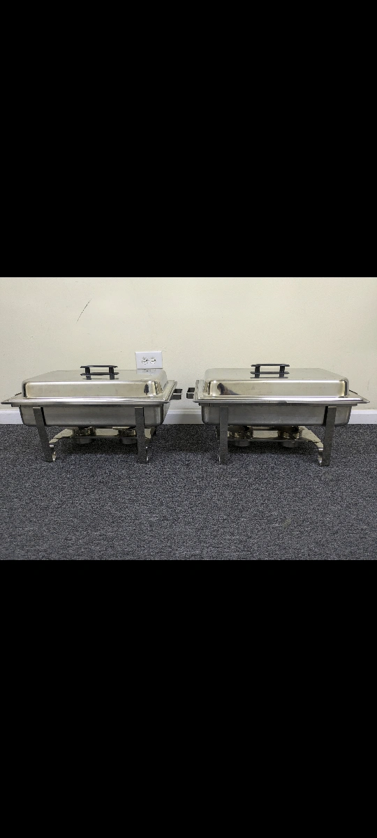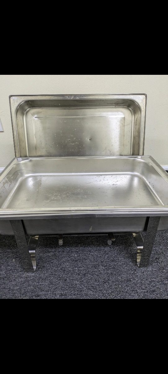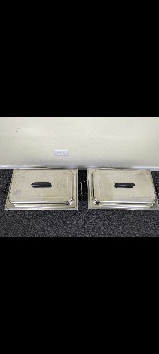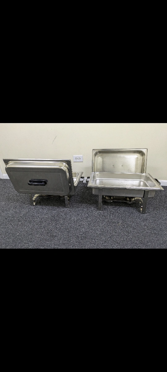 Two stainless steel chafing dishes are available. They are in used condition, as you can see in the photos. Perfect for catering or keeping food warm at events