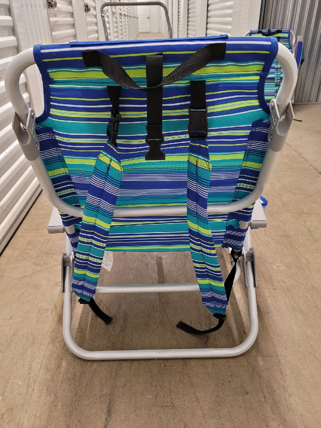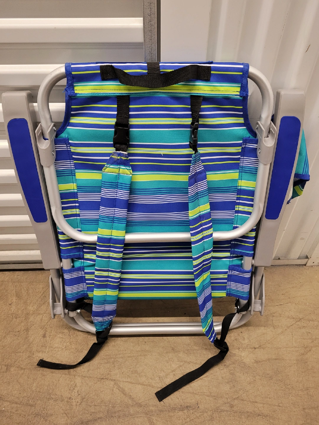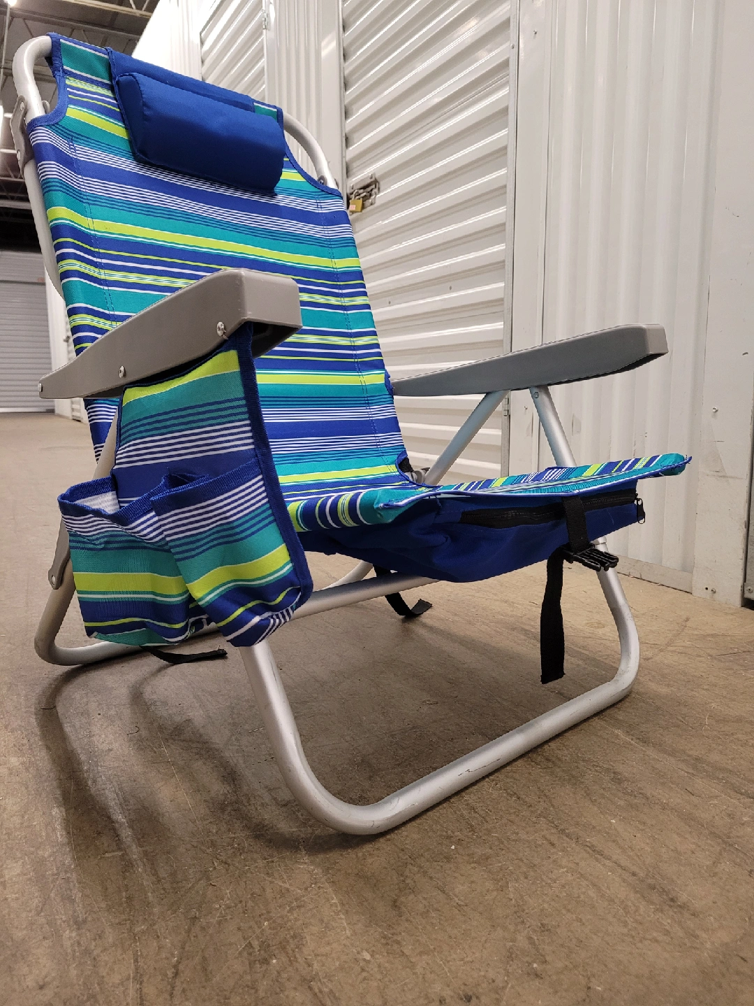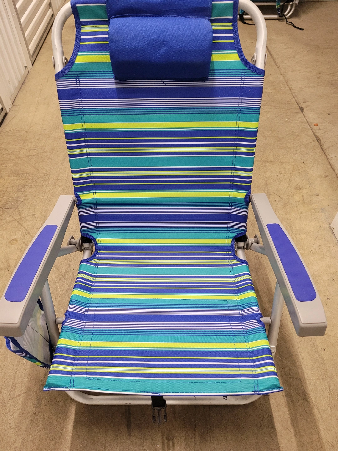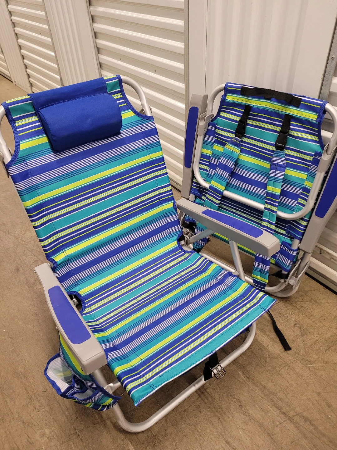 This is for 2 beach chairs with a blue, green, and yellow striped pattern. It features a comfortable headrest and convenient straps for carrying. It also has a side cup holder and under seat pocket for storage.