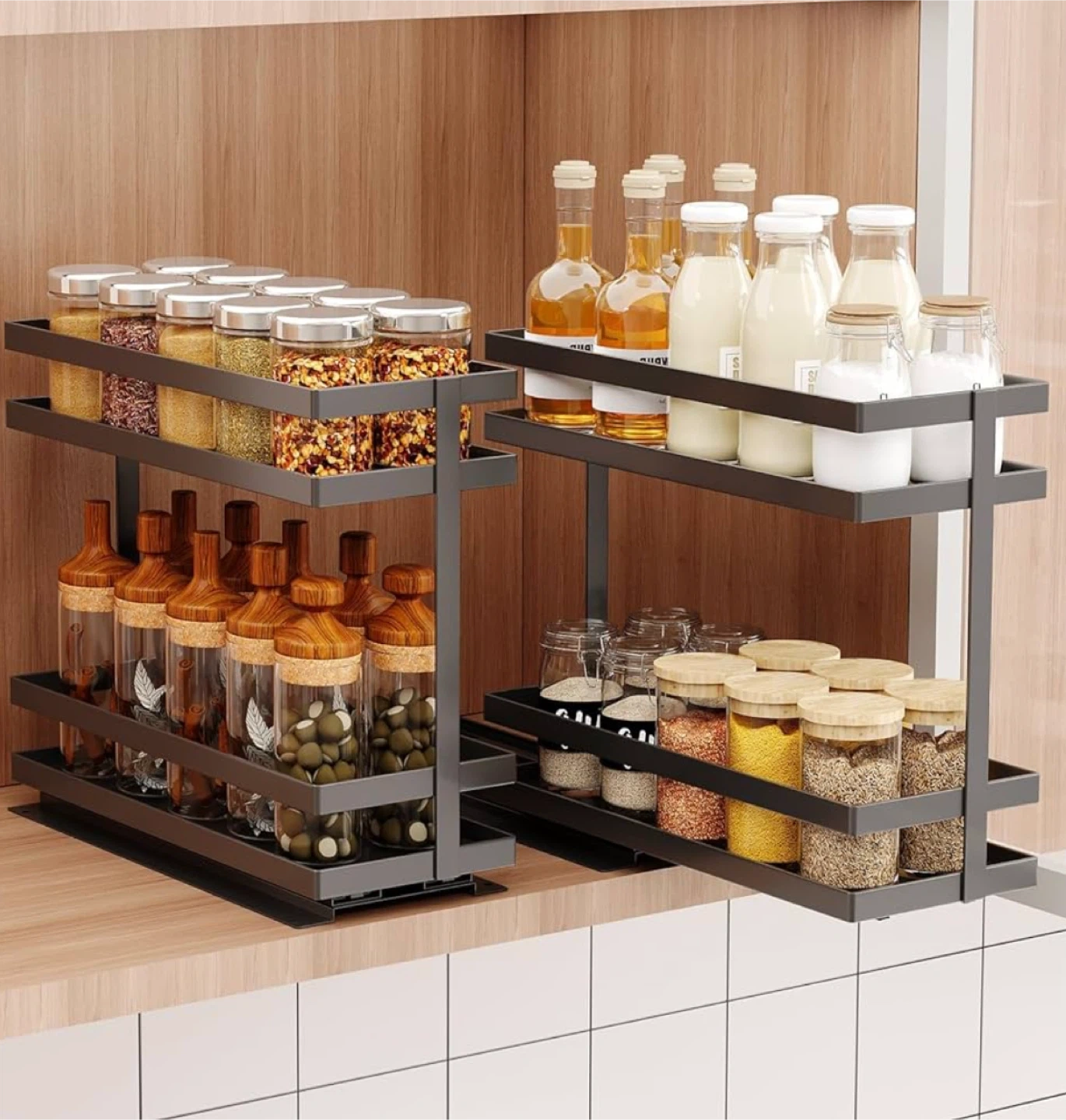This is a two-tier pull-out spice rack organizer. It's a great way to keep your spices organized and easily accessible. The shelf requires no assembly and features a removable base for easy mounting. The easy-to-clean PVC mat makes maintenance a breeze!