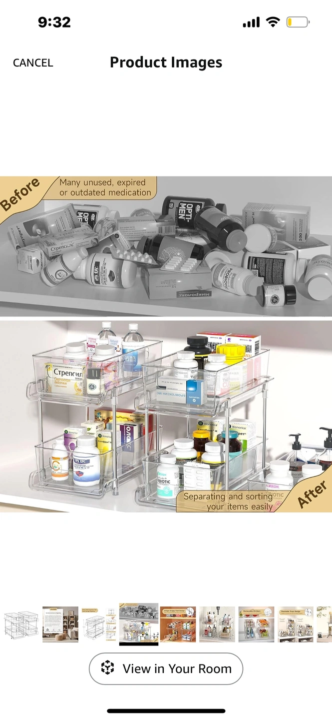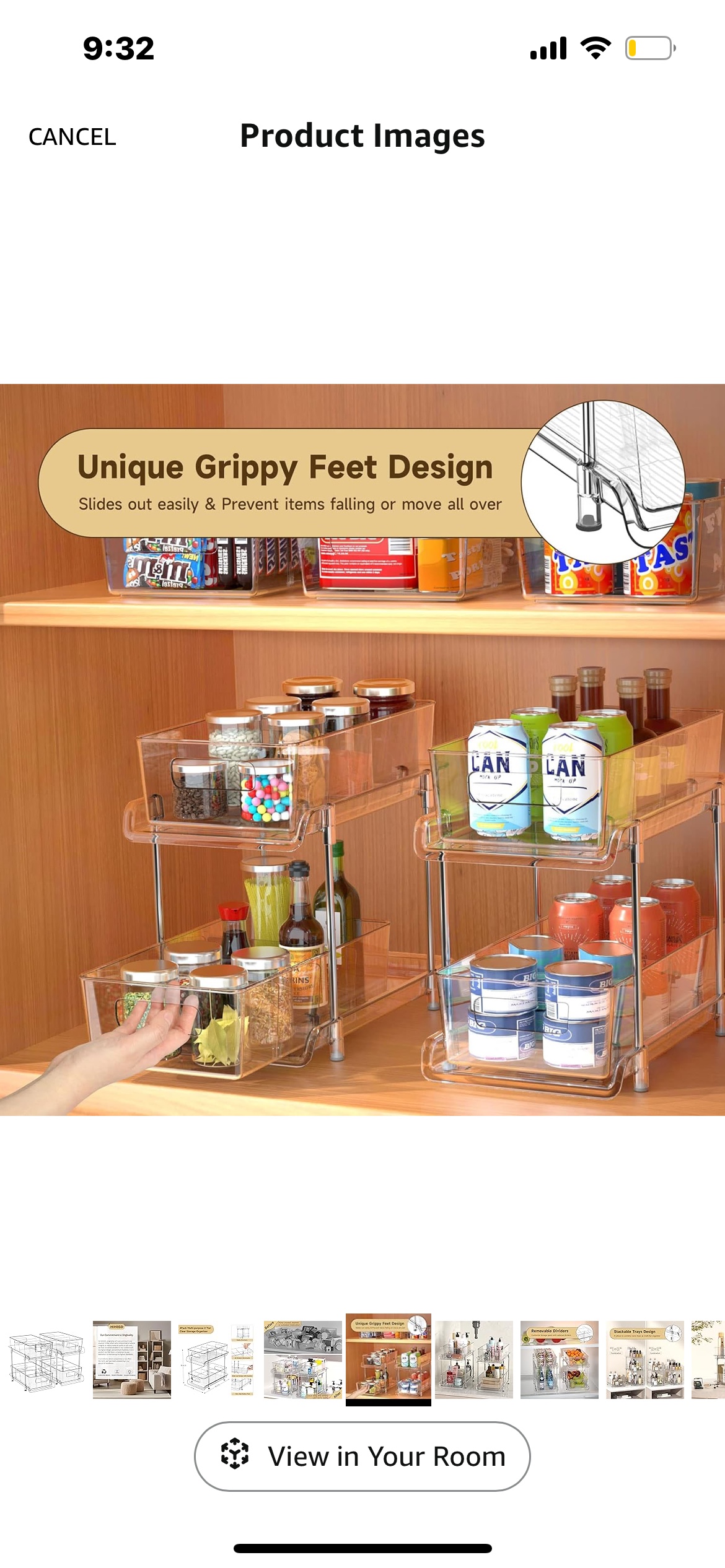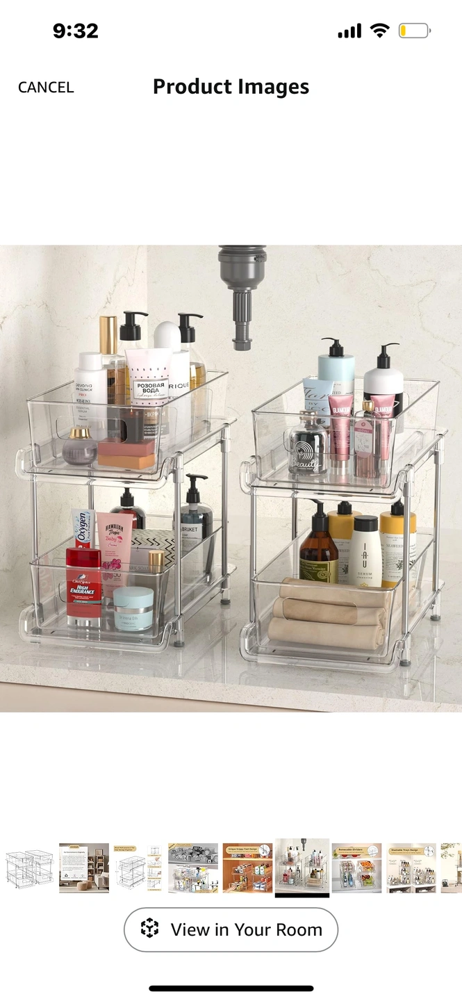 Clear plastic storage shelf that is perfect for organizing your kitchen or bathroom. It has two tiers that can hold various items, and it has a unique grippy feet design that prevents it from sliding.