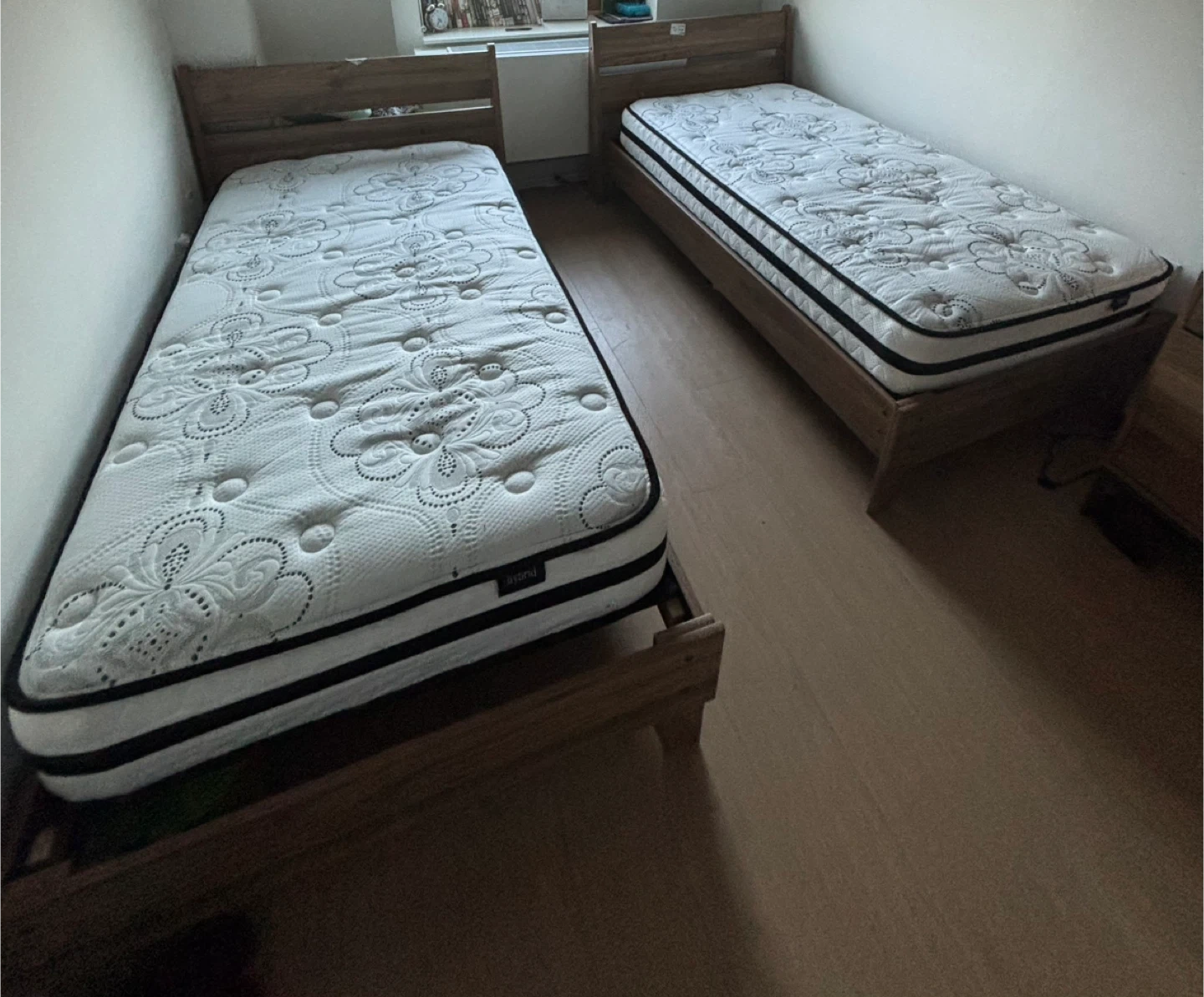 60Selling 2 twin beds mattresses included excellent condition. Used few weeks. Just moved and realized they need a bunk bed the room is too small for all the stuff they have. It has a white top with a black and white striped border. Perfect for a guest room or kids' room. $400