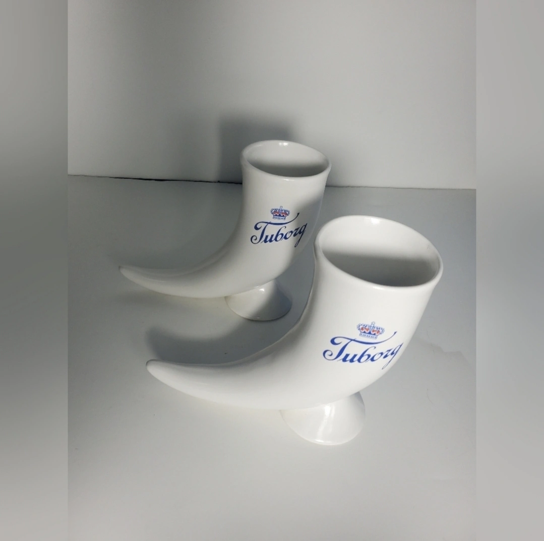 2 Vintage Tuborg Danish Mug White Beer Ceramic Drinking Horn Collectable Tuborg Color: White These Ceramic Mugs feature a classic design with a capacity of 10 oz. Measurements: Approx 5 3/4" High x 6 3/4" Across Top diameter is 2 3/4" Great as a decorative accent in any home bar or man cave. No chips, crazing or cracks. On one horn has scuff markings Please see pictures for imperfections Good Conditions