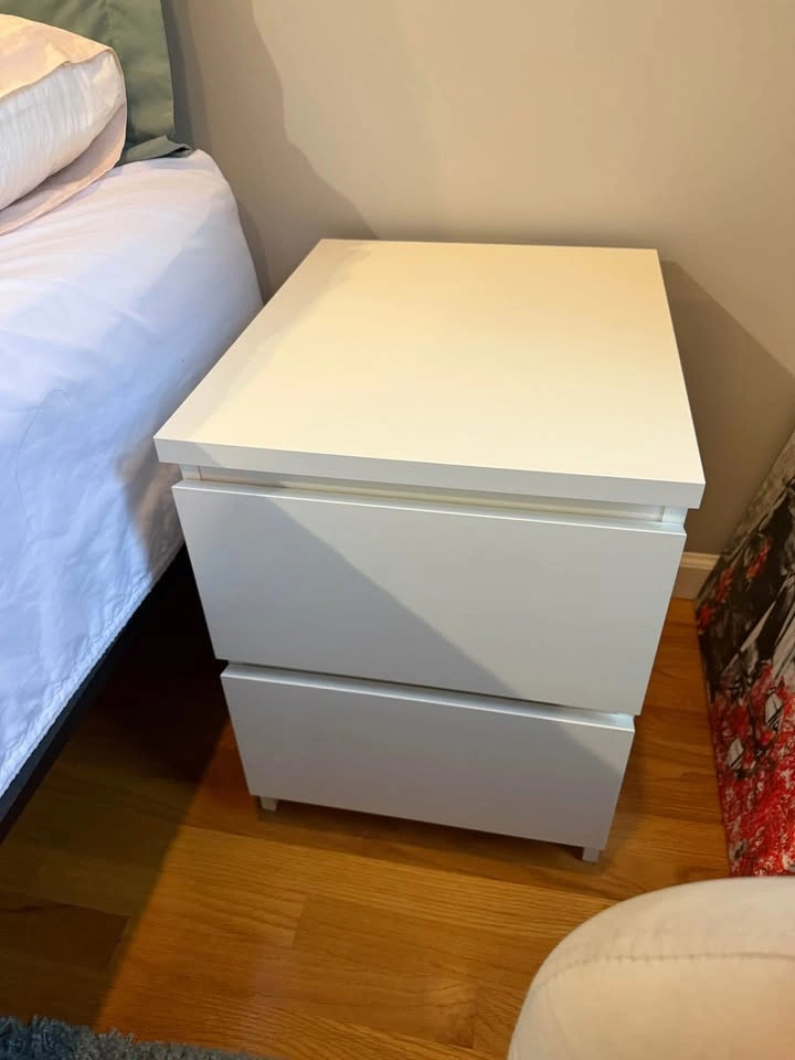 2 white IKEA Malm nightstands. $40 each or $75 for both. These are no longer sold in the US. Here's the listing in the UK — it's being sold for £49 or $65. https://www.ikea.com/gb/en/p/malm-chest-of-2-drawers-white-80214549/ A similar one in the US now is Storklinta, which is listed at $79.99 https://www.ikea.com/us/en/p/storklinta-nightstand-white-with-2-drawers-90559296/