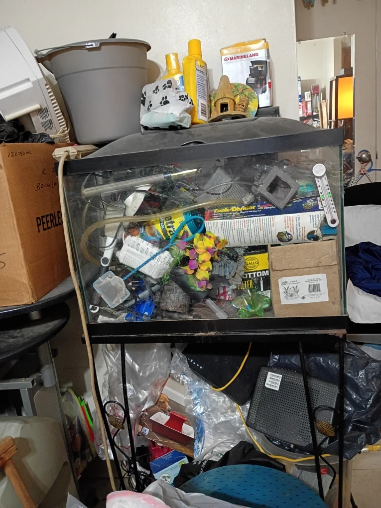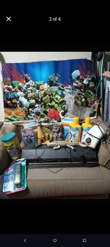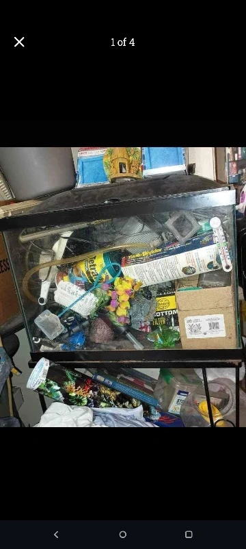 60Glass fish tank with Marineland LED blue and white lighting lid (lid sells separately for $96. alone on Amazon). Sits on a strong wrought iron stand with shelf also on bottom for breeding tank or supplies. Everything needed is included except fish and water !! ๐ penguin BIO wheel pump with about a years supply of filters because I forgot to cancel them on my chewy autoship. Same with food and water conditioners... new and sealed from chewy. Heaters, air pumps, tubing and bubblers.... a gargoyle and an alligator that mouth opens and closes.. Too many decorations and extras to list. Nets, thermometers, new back drop, floating baby tank, magnetic wall cleaner, etc.etc. First $125. obo tonight gets everything !!!!!!