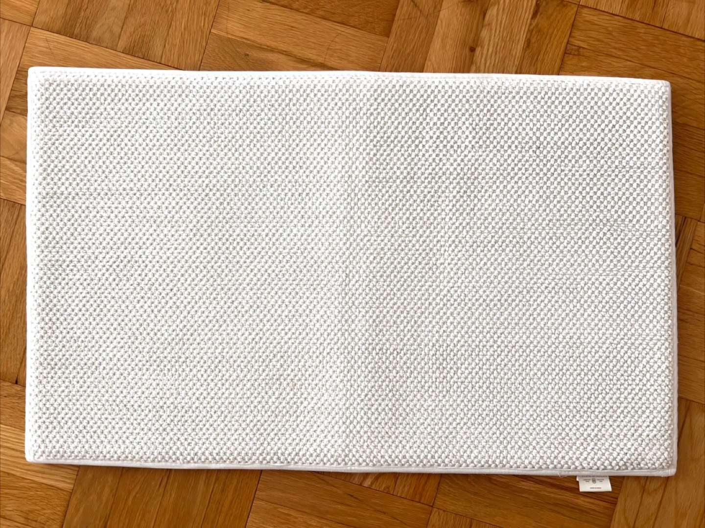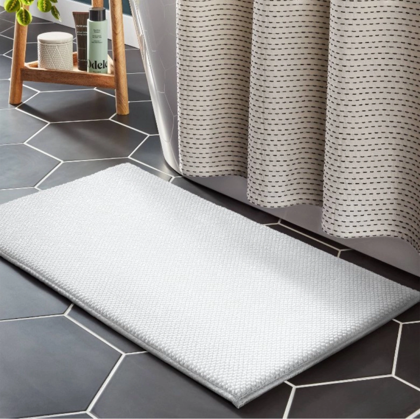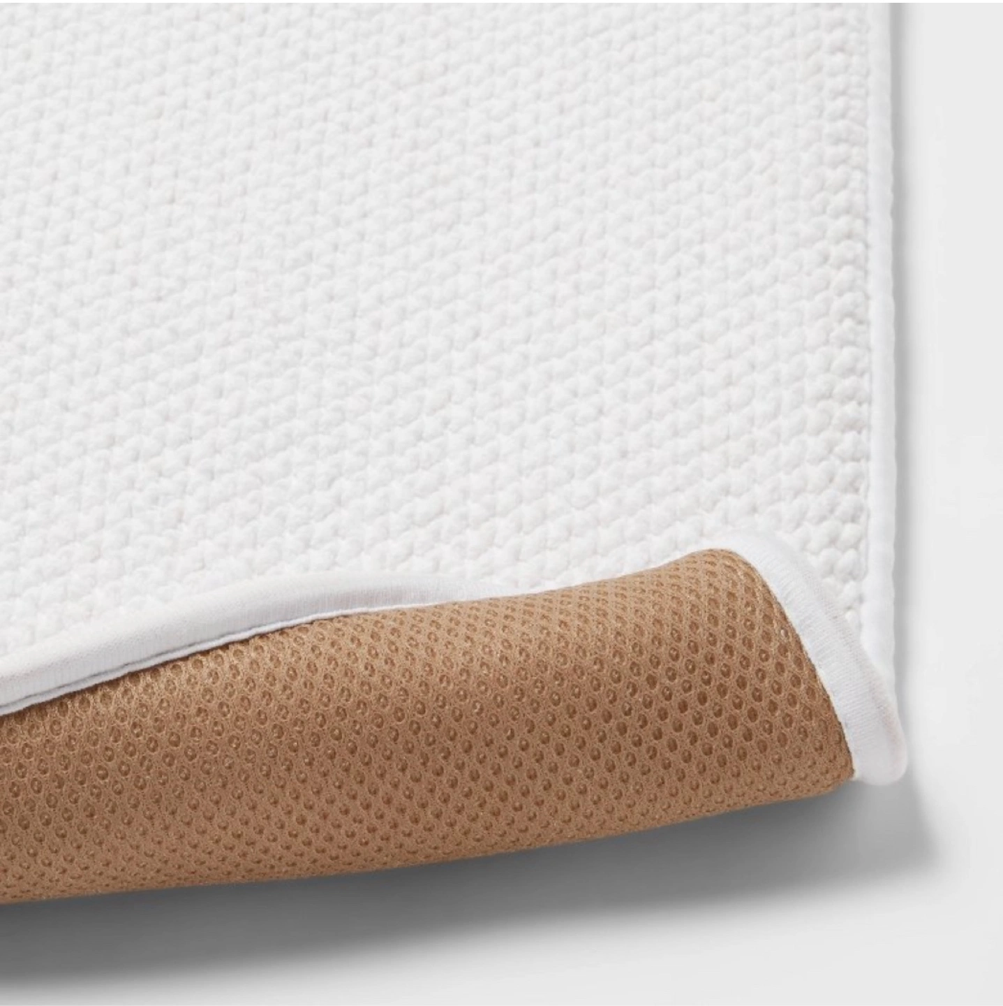 Used less than 3 times as a spare bath rug. Give a luxurious spa-like touch to your bathroom with this Performance Plus Cotton Memory Foam Bath Rug from Threshold™. The rectangular bath mat features a lightweight woven construction in a textured solid color to effortlessly complement your bath space. It's made from 100% cotton and memory foam, which makes your feet comfortable when standing on it and absorbs moisture from your wet feet to keep your space clean and dry.