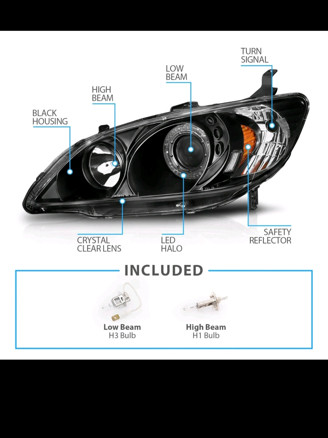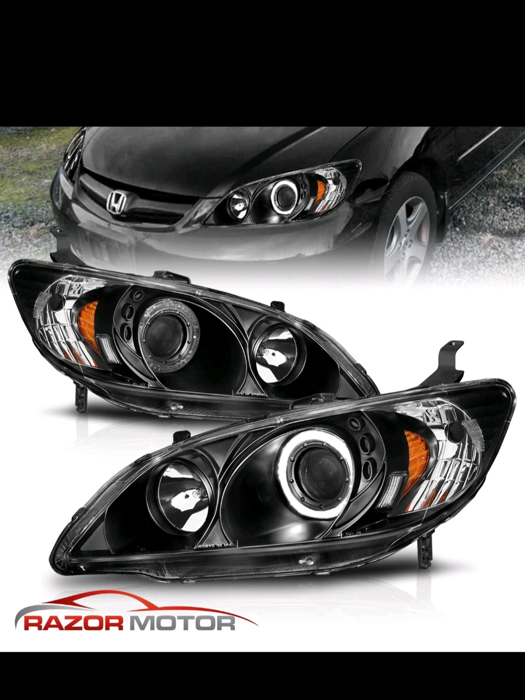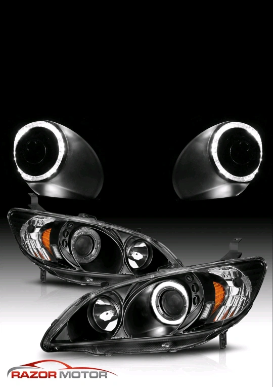 5The [LED Halo] For 2004 2005 Honda Civic Coupe/Sedan Black Projector Headlights Pair by RazorMotor is a performance/custom fitment type headlight assembly specifically designed for the Honda Civic Coupe and Sedan models. These black halo projector headlights come with bulbs included and feature a clear lens design with a black housing. They are DOT and SAE compliant and certified, making them a reliable and high-quality choice for customizing your vehicle's front lighting. Designed for cars, these headlights provide a unique and stylish look to your Honda Civic.