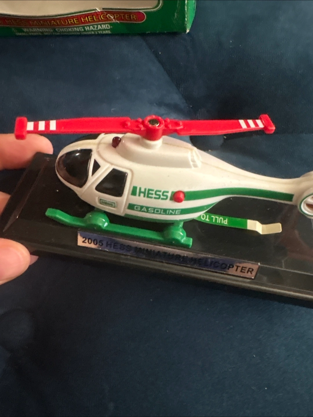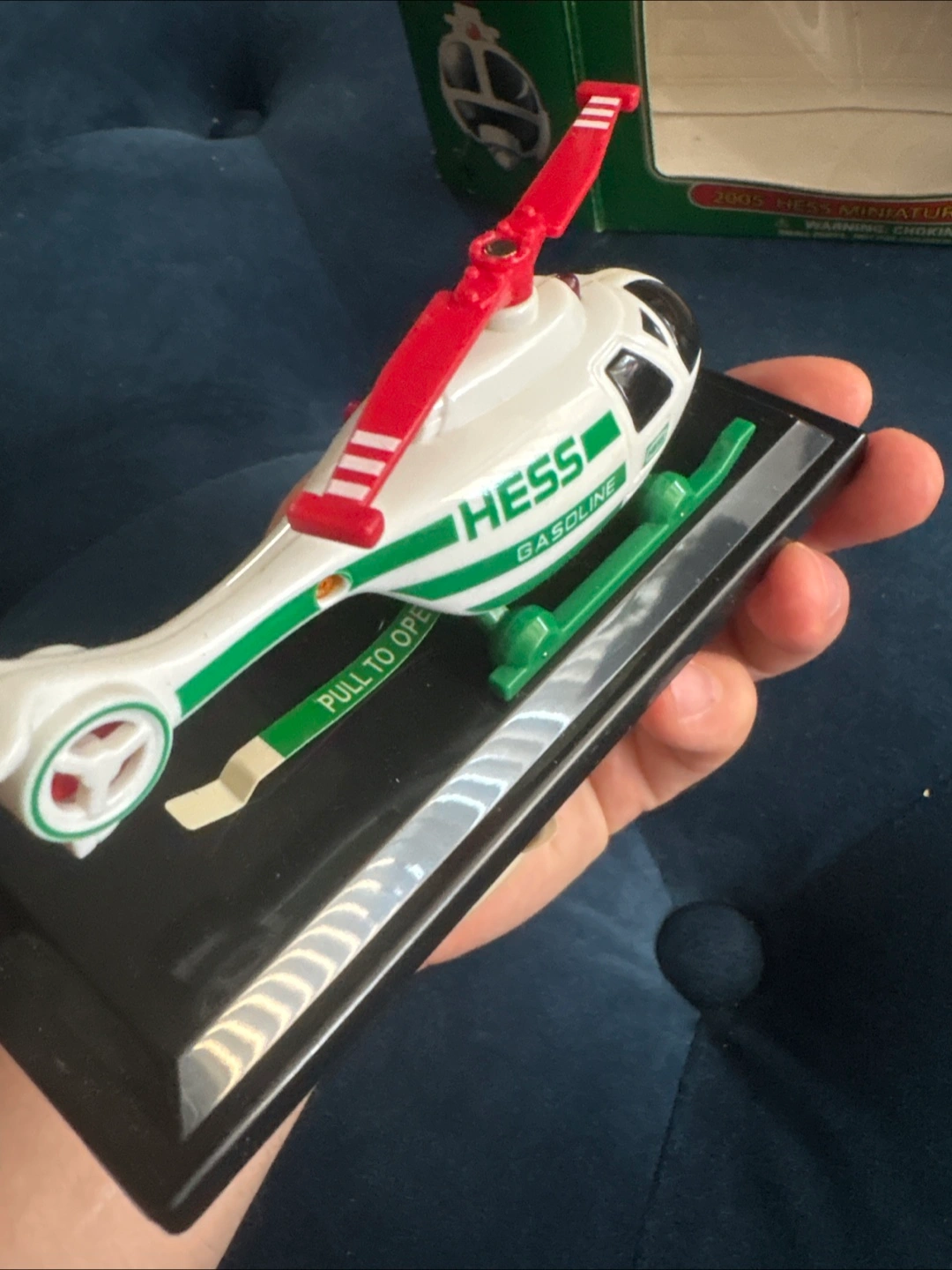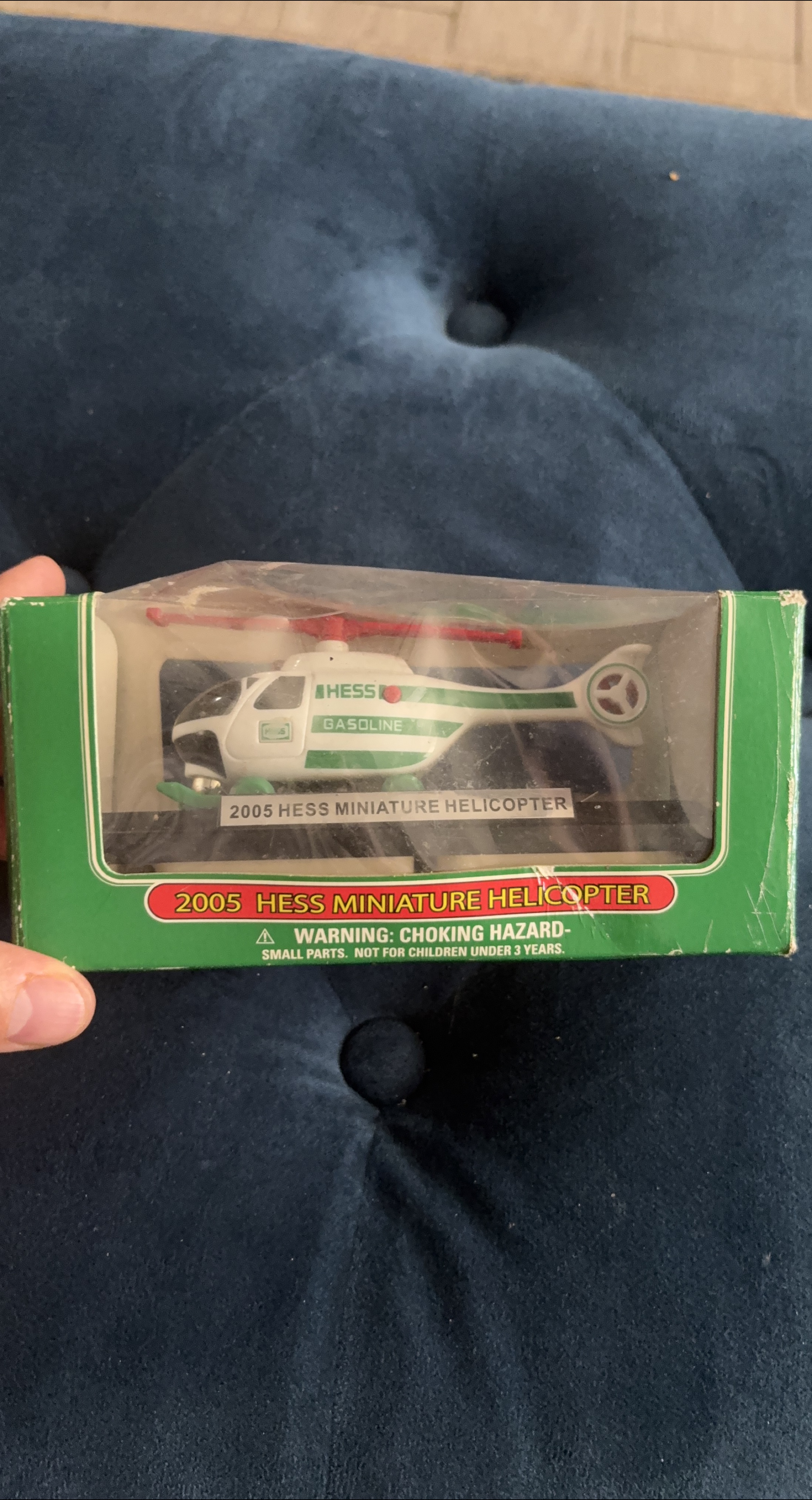Selling a 2005 Hess Miniature Helicopter! It's in great condition and comes with the original box. A perfect addition to any Hess toy collection. Never been used. Box is a little old but toy is in perfect condition. As seen battery bull cord hasn’t been removed.