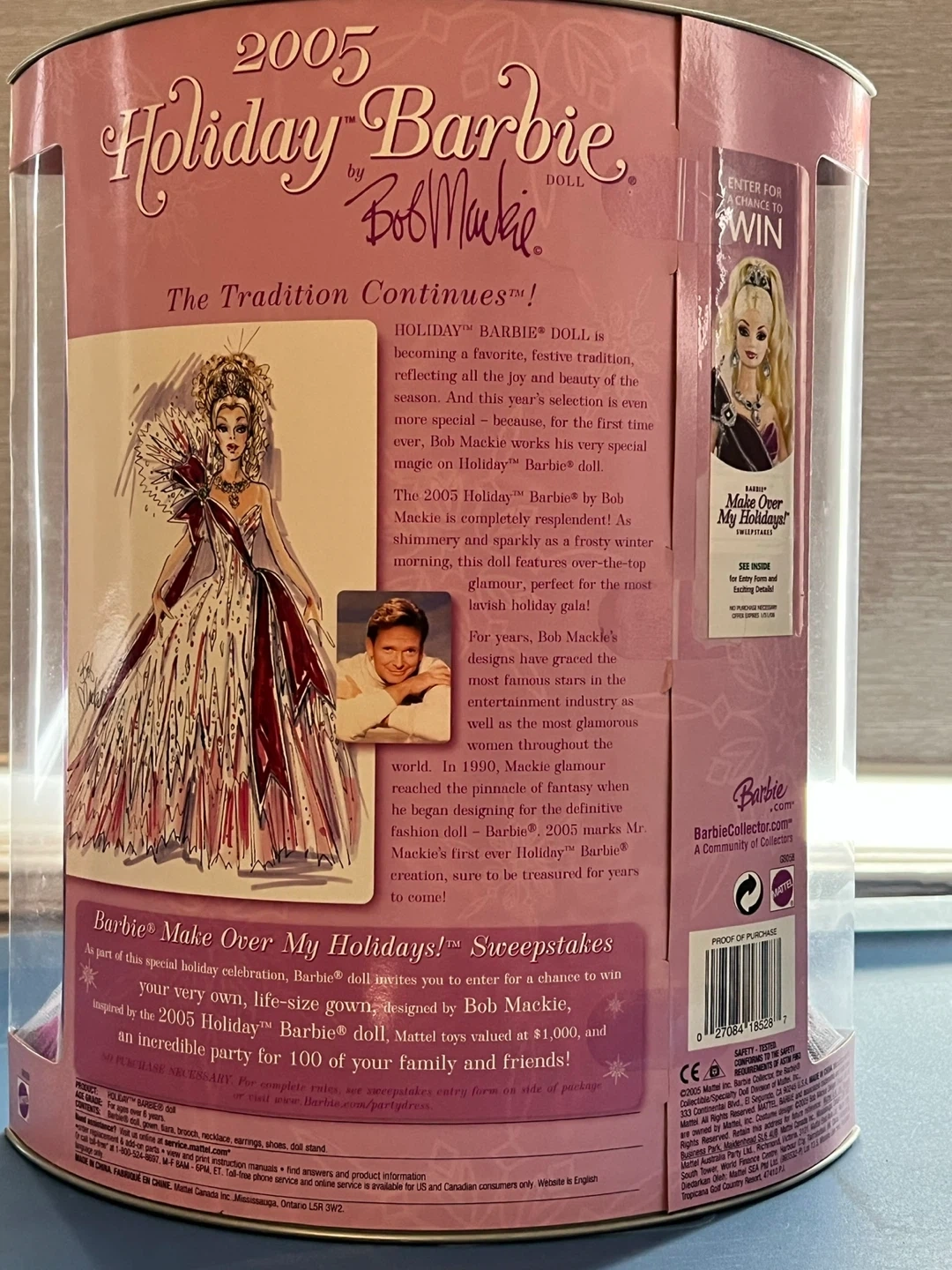 10Selling a 2005 Holiday Barbie Doll by Bob Mackie! This Barbie doll is becoming a favorite, festive tradition, reflecting all the joy and beauty of the season. The 2005 Holiday Barbie by Bob Mackie is completely resplendent! Barbie invites you to enter for a chance to win your very own, life-size gown designed by Bob Mackie, inspired by the 2005 Holiday Barbie doll, Barbie toys valued at $1,000, and an incredible party for 100 of your family and friends