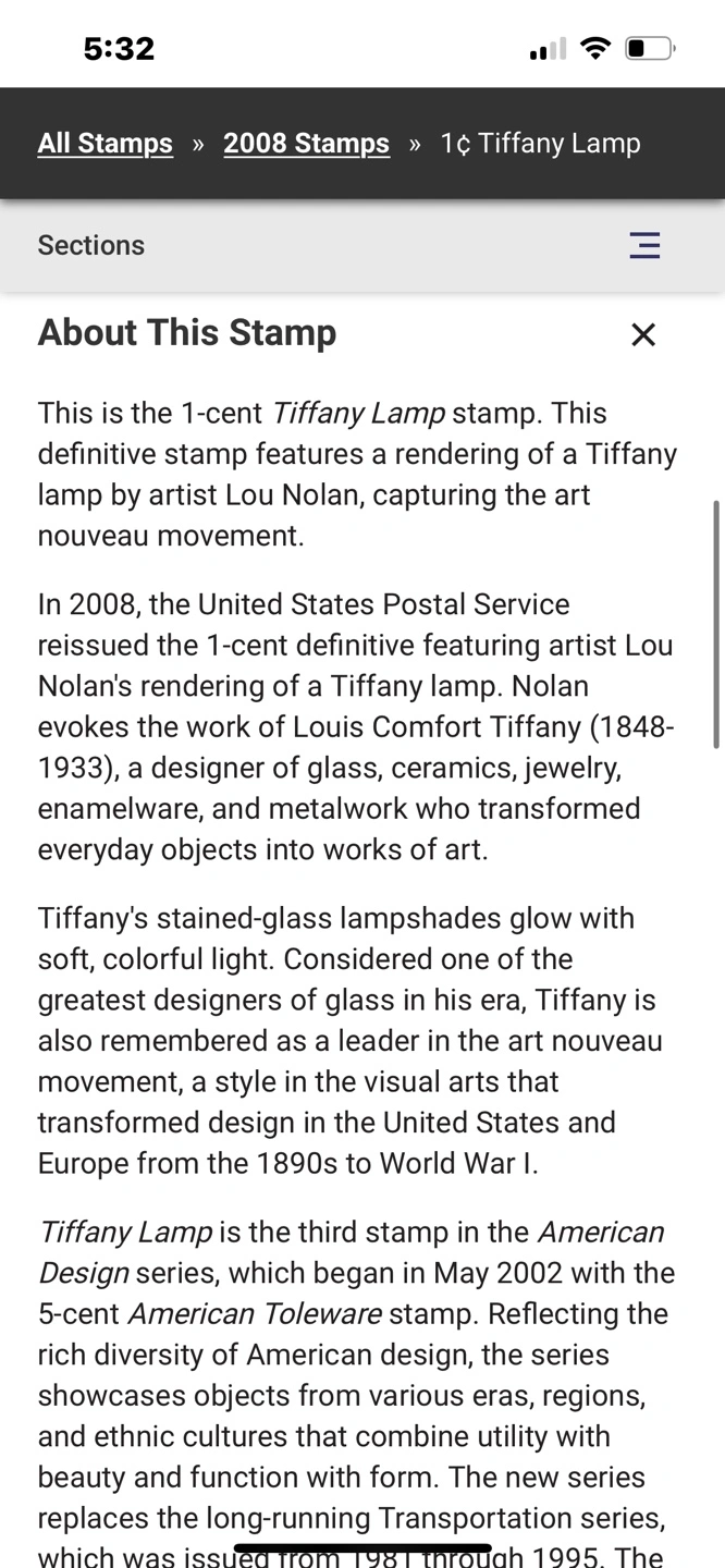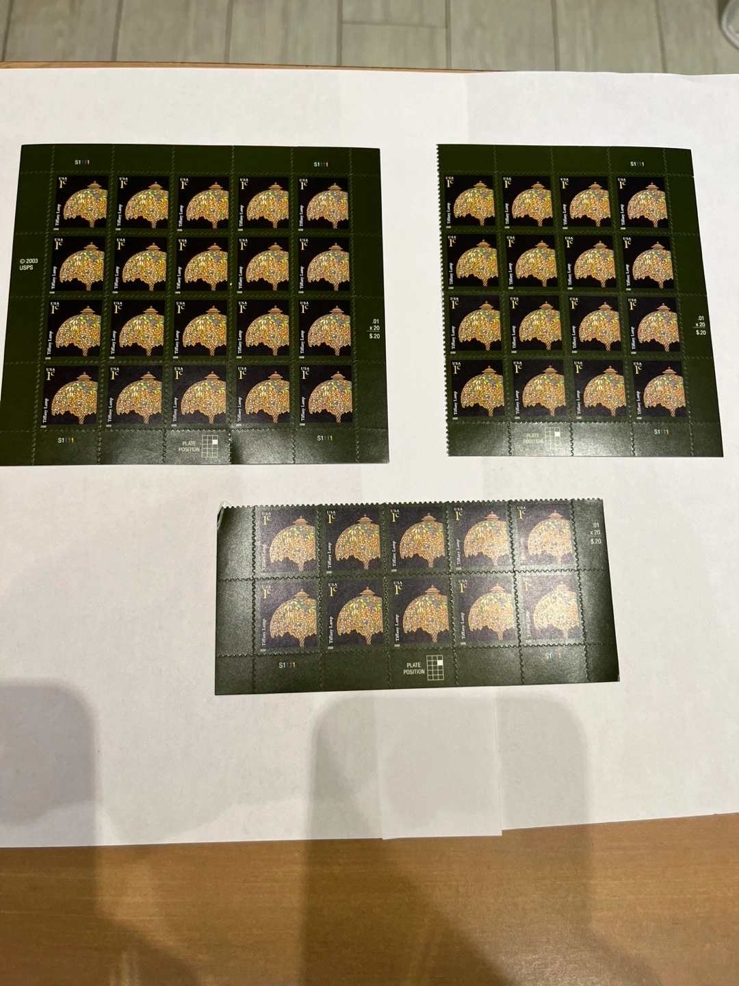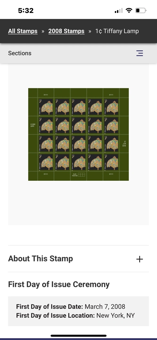 98- Full sheet of New/Used 2008 1¢ Tiffany Lamp stamps. - Three panes of 20, 16 and 10 stamps per pane. - Total of 46 Stamps. - Great for a Collector’s collection.