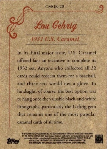 65The 2011 Topps Cmg Worldwide vintage reprints Lou Gehrig #CMGR-20 trading card is a standard-sized sports trading card featuring the legendary Major League Baseball player Lou Gehrig. Manufactured by Topps in 2011, this card is part of the Cmg Worldwide vintage reprints insert set, showcasing Gehrig in his New York Yankees uniform. Made of card stock with a thickness of 20 pt, this English-language card is a must-have for any baseball fan or collector looking to add a piece of MLB history to their collection.