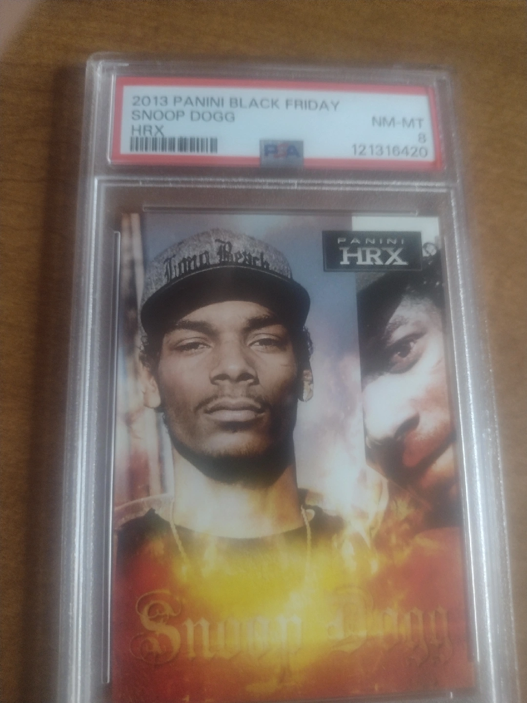 Selling a 2013 Panini Black Friday Snoop Dogg HRX trading card. It's in NM-MT condition and graded an PSA 8. Great for any Snoop Dogg or trading card collector!