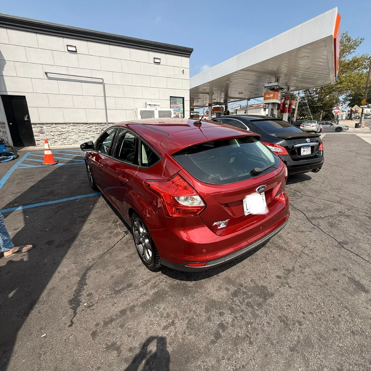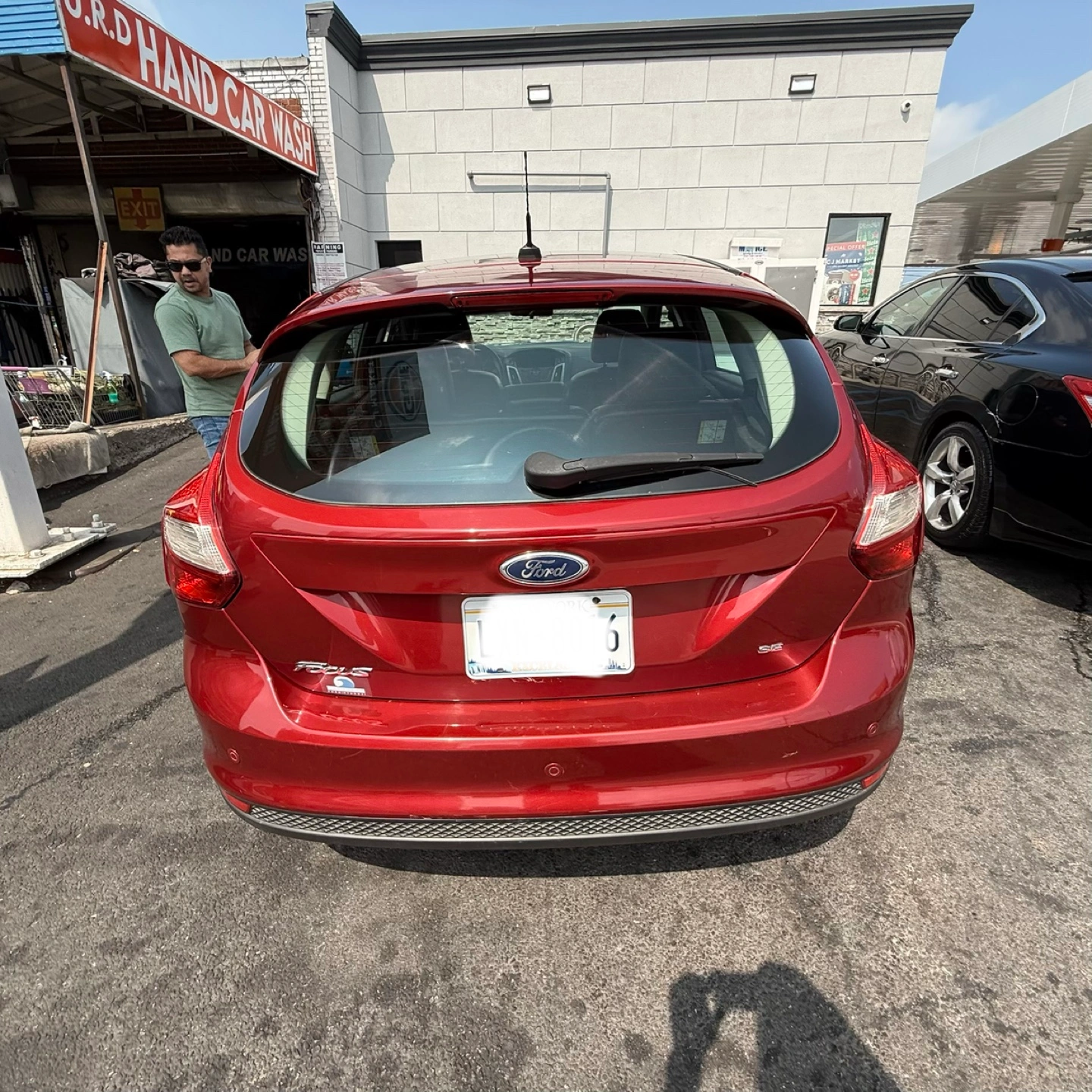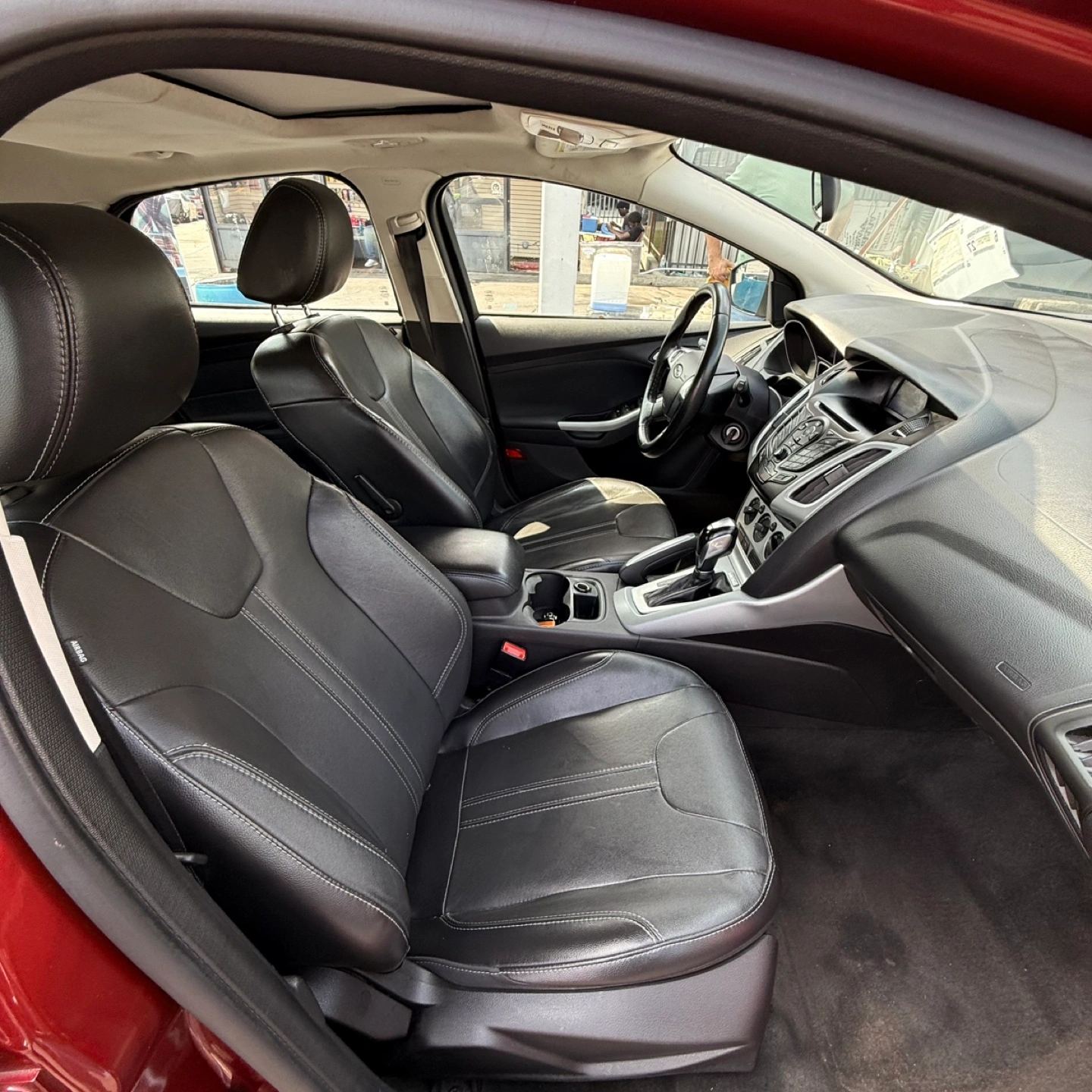 Selling a red Ford Focus SE hatchback. It appears to be in good condition, perfect for getting around town!