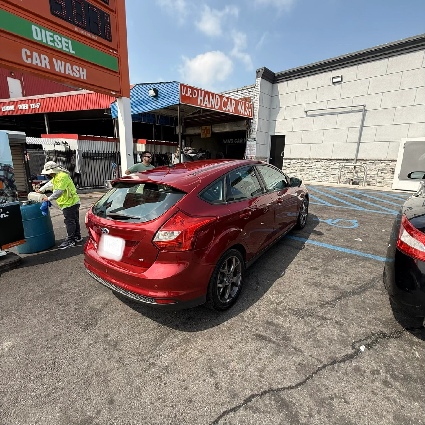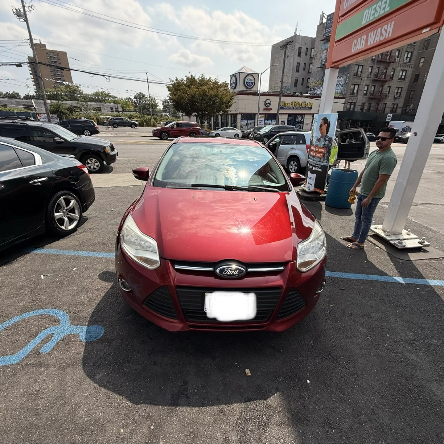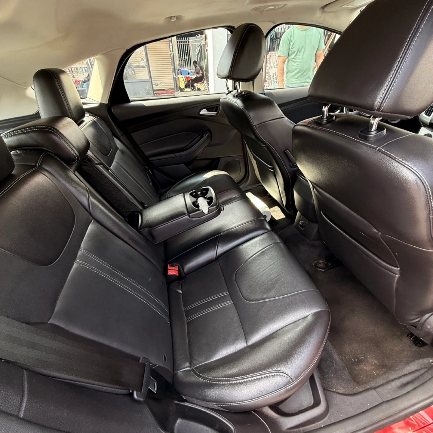 Selling a red Ford Focus SE hatchback. It appears to be in good condition, perfect for getting around town!