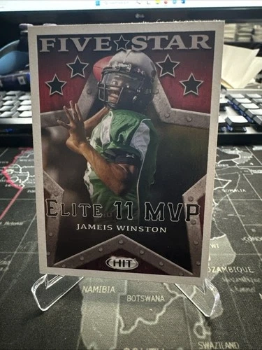 65The product is a 2015 SAGE HIT trading card featuring Jameis Winston, who won the Elite 11 award. The card is a standard size football trading card and is considered a rookie card. It is a single card from the 2015 Sage Hit set and does not have an autograph. The card showcases Winston as a player from the Tampa Bay Buccaneers in the NFL, making it a valuable collectible for fans of football trading cards.