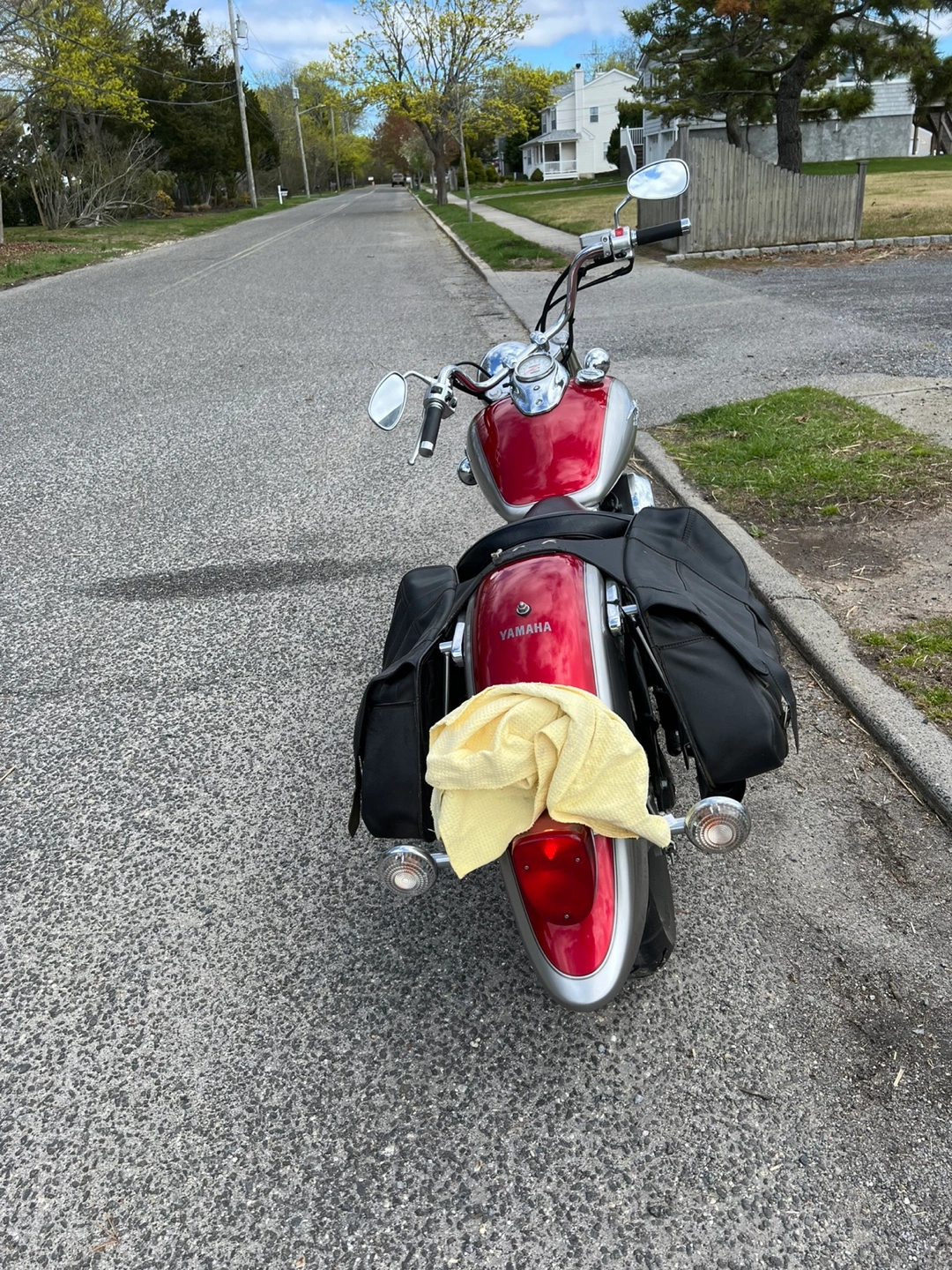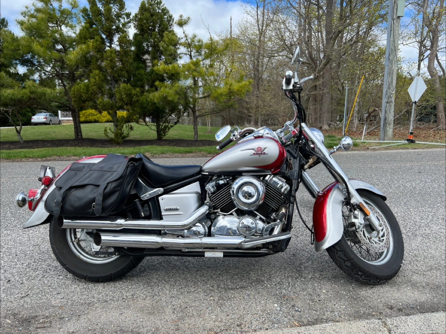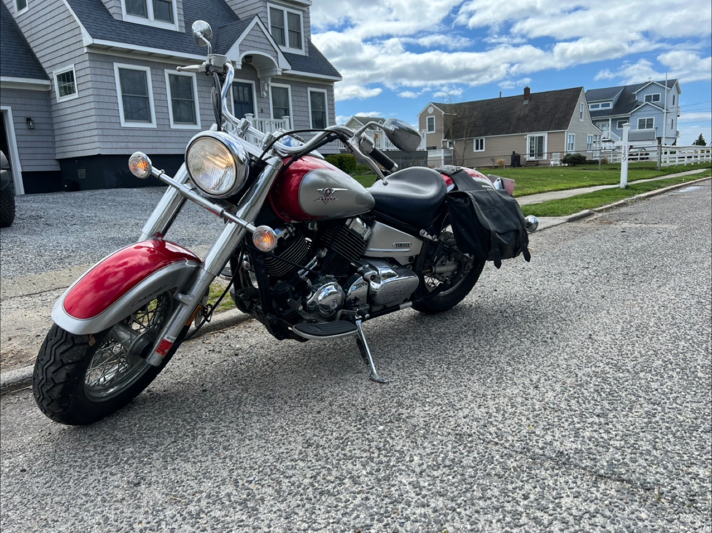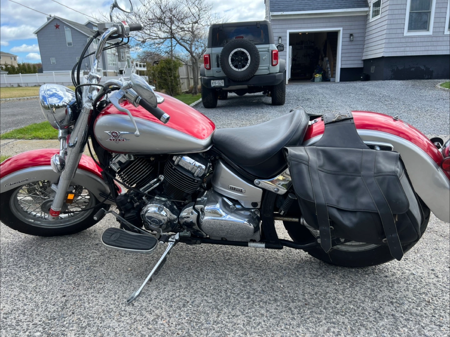 Selling my Yamaha V Star 650 Classic motorcycle. It has a red and silver color scheme and includes saddlebags. The odometer reads 14,082 miles. Upgraded Vance and Hines exhaust. Single owner and well maintained.
