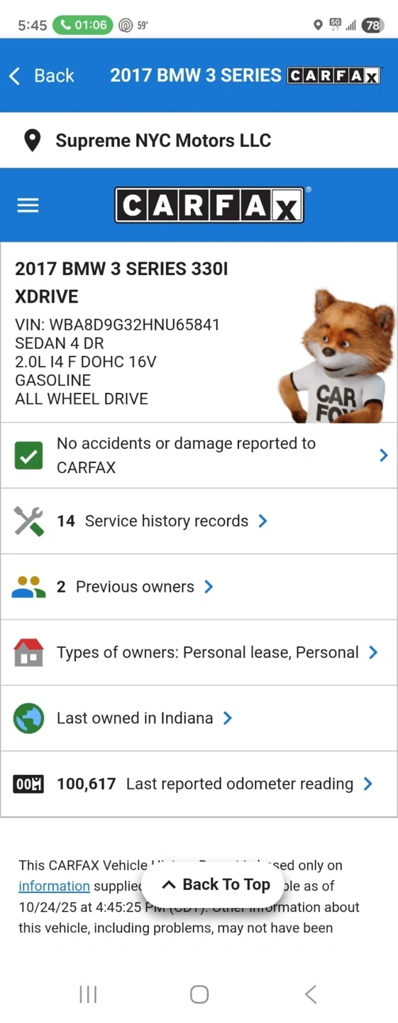 17Up for sale is my 2017 BMW 330i xDrive (All-Wheel Drive) in outstanding condition — garage-kept, meticulously maintained, and 100% accident-free with a clean Carfax. This luxury sport sedan runs and drives flawlessly, offering the perfect blend of performance, comfort, and technology. Only 100,000 miles, and it shows like a much newer car. Everything works as it should, including the backup camera, navigation, and all premium features. ⸻ 🔹 Key Features & Equipment • 2.0L Turbocharged 4-Cylinder Engine • 8-Speed Automatic Transmission with Sport & Manual Modes • BMW xDrive All-Wheel Drive System • Backup Camera • Navigation System (iDrive) • Power Sunroof / Moonroof • Heated Leather Seats • Dual-Zone Automatic Climate Control • Premium Package • Technology Package • Bluetooth Audio & Hands-Free Calling • Harman Kardon Premium Sound System • Keyless Entry & Push-Button Start • LED Headlights & Fog Lights • Rain-Sensing Wipers • Power Memory Seats • Alloy Wheels • Garage-Kept / Non-Smoker Vehicle ⸻ 🔹 Condition • Mechanically perfect – no warning lights, leaks, or issues • Smooth transmission and tight steering • Interior is clean and well cared for • Exterior paint shines beautifully – no dents or major scratches • Tires and brakes in great shape ⸻ 🔹 Extras • Two original BMW keys • All original books and manuals • Recently serviced and inspected This 330i xDrive is ready for its next owner — luxury, performance, and reliability all in one package. Serious buyers only, please.
