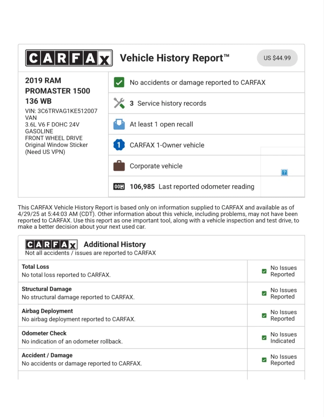 10Mechanic Special Selling my 2019 Ram ProMaster with 162,400 miles. I am the original owner. The van has been reliable and served me well, but it currently needs an engine. 3.6 L Engine Van will need to be towed as-is. I have a the CarFax Report if you’re interested Clean Illinois title, 1-owner vehicle Located at an auto repair shop in Elmhurst, IL Asking $6,200 or best offer Not a dealer – sorry no trades and no payment plans Sold as-is I recently purchased a new van, so I no longer need this one. If interested, please message me to arrange a time to see it. Ford Transit Econoline Sprinter 1500 2500 3500 Nissan NV Chevy Chevrolet Express Cargo Van