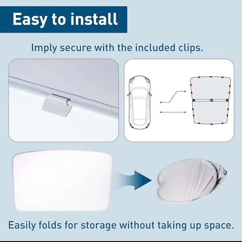 Perfect Fit: Designed for 2021-2024 Tesla Model Y with 1:1 original car customization—no size gaps. UV & Heat Protection: Advanced sun protection technology with upgraded heat insulation material. Reflects sunlight and keeps your car cool. Premium Materials: Made from 95% polyester and 5% spandex with an ice crystal silver coating. Durable, odorless, and maintains a constant temperature. Foldable & Portable: Easy to fold and unfold in 1 second. Includes a storage bag for convenience. Quick Installation: Comes with a detailed installation guide. Includes 1 front sunshade, 1 rear sunshade, 1 storage bag, and buckles. Packing List: Front-part sunshade, rear-part sunshade, storage bag, 12 Buckle-A, 2 Buckle-B, 2 Buckle-C.