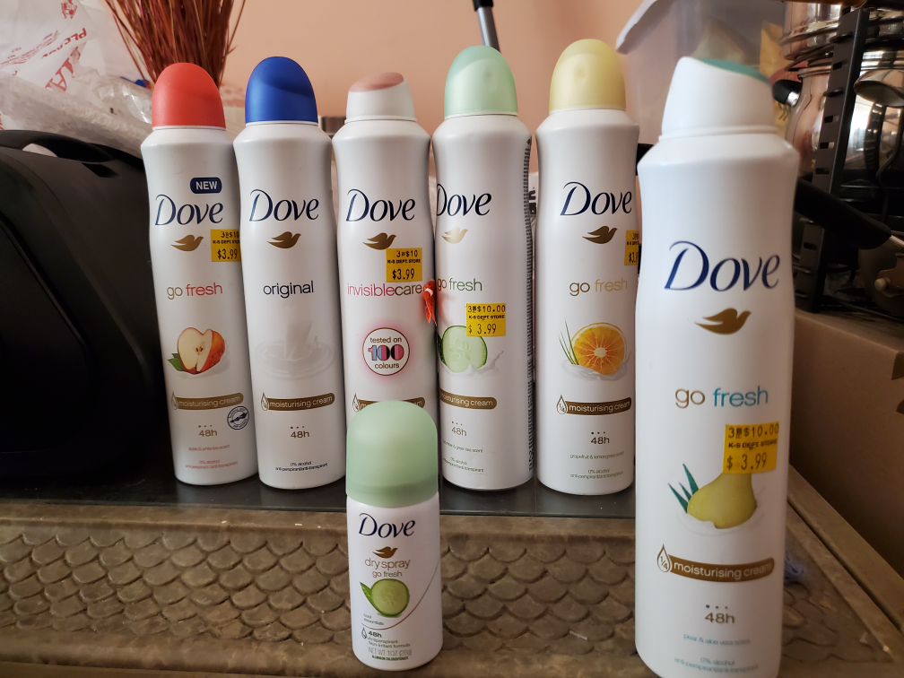 5 almost-full bottles of 250ml Dove Spray Antiperspirant. Each bottle has been sprayed about 2-3 times, so it's barely used- besides the Pear scent. I stopped using since the scents were too perfumey. Also throwing in the portable cucumber spray and an almost finished 250ml Pear spray.