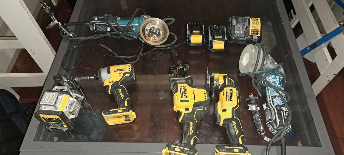 Dewalt Cordless Impact Driver 20V, Dewalt cordless Oscillating Multi-tool 20V, Cordless Compact Reciprocating Saw 20V, 2 Makita circular saws with cord 120V, 2 batteries and charging port asking for $350.