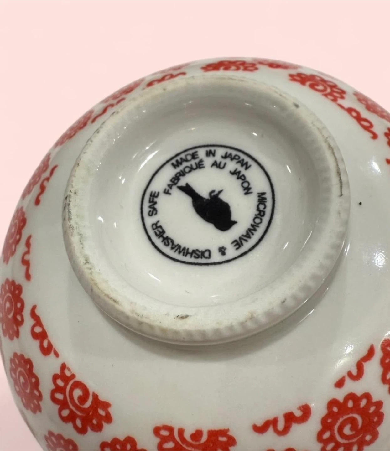 This is a white ceramic bowl made in Japan. It features a red floral pattern. It's dishwasher and microwave safe. The bowl's dimensions are approximately 4.5 inches in diameter and 2.5 inches in height.