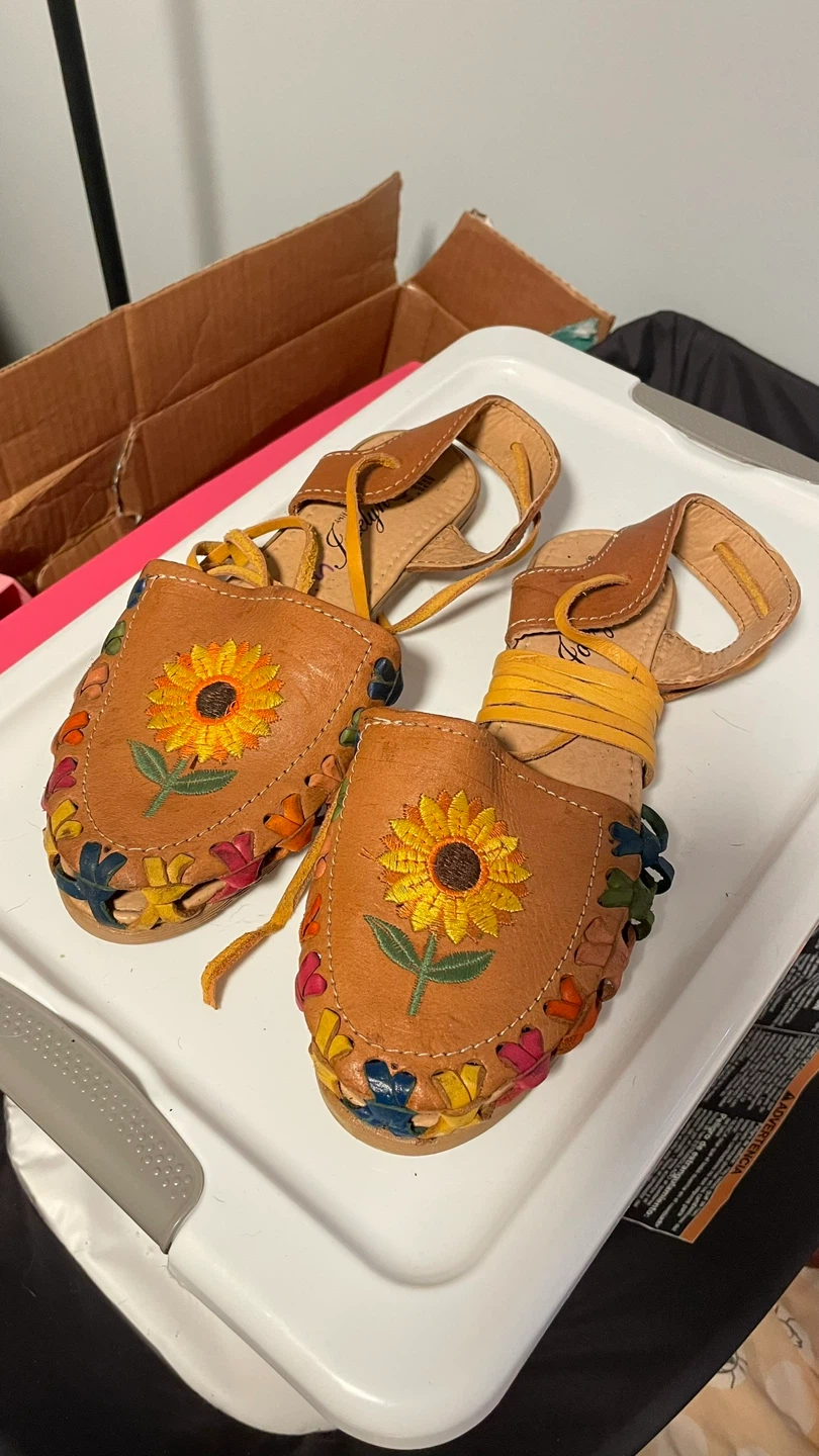 These handcrafted huarache sandals feature a rich brown leather. They're adorned with vibrant embroidered sunflowers and colorful woven accents. Perfect for a touch of artisanal flair!