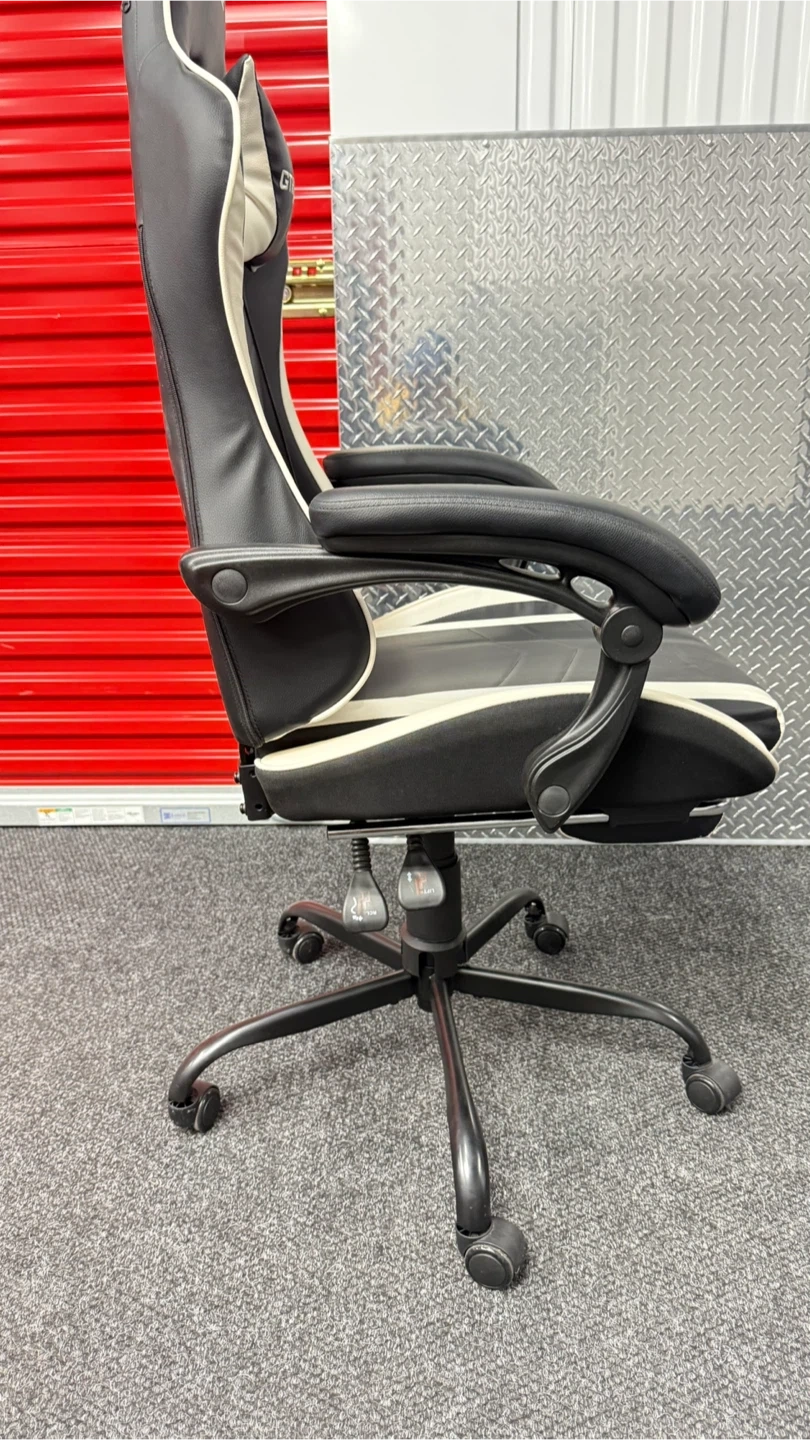 This GTRACING gaming chair is upholstered in black and white faux leather. It's designed for comfort during long gaming sessions. The chair includes a retractable footrest for added relaxation.
