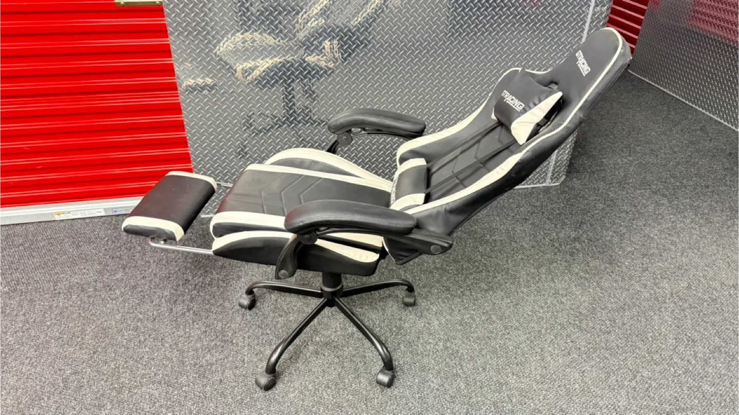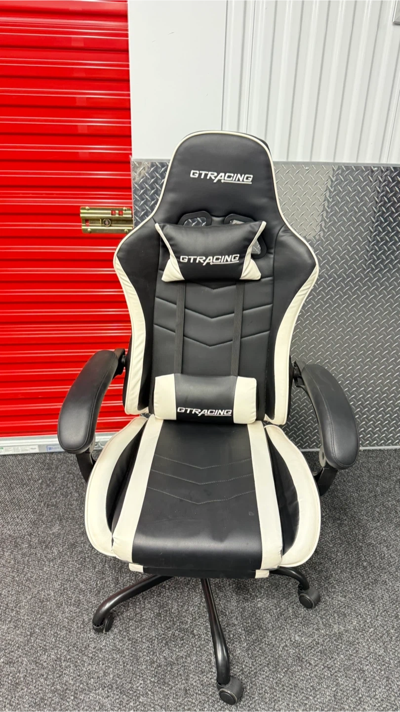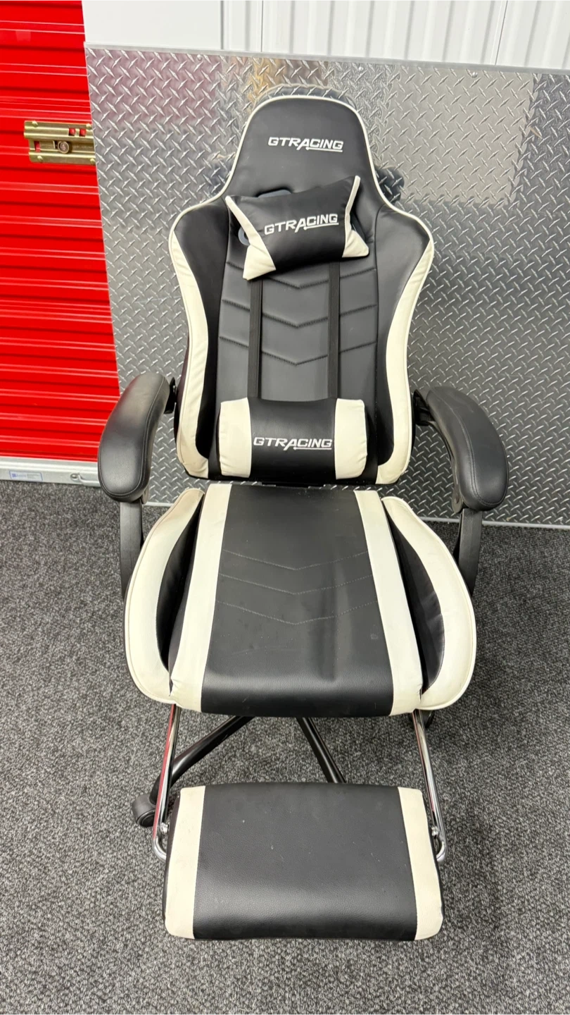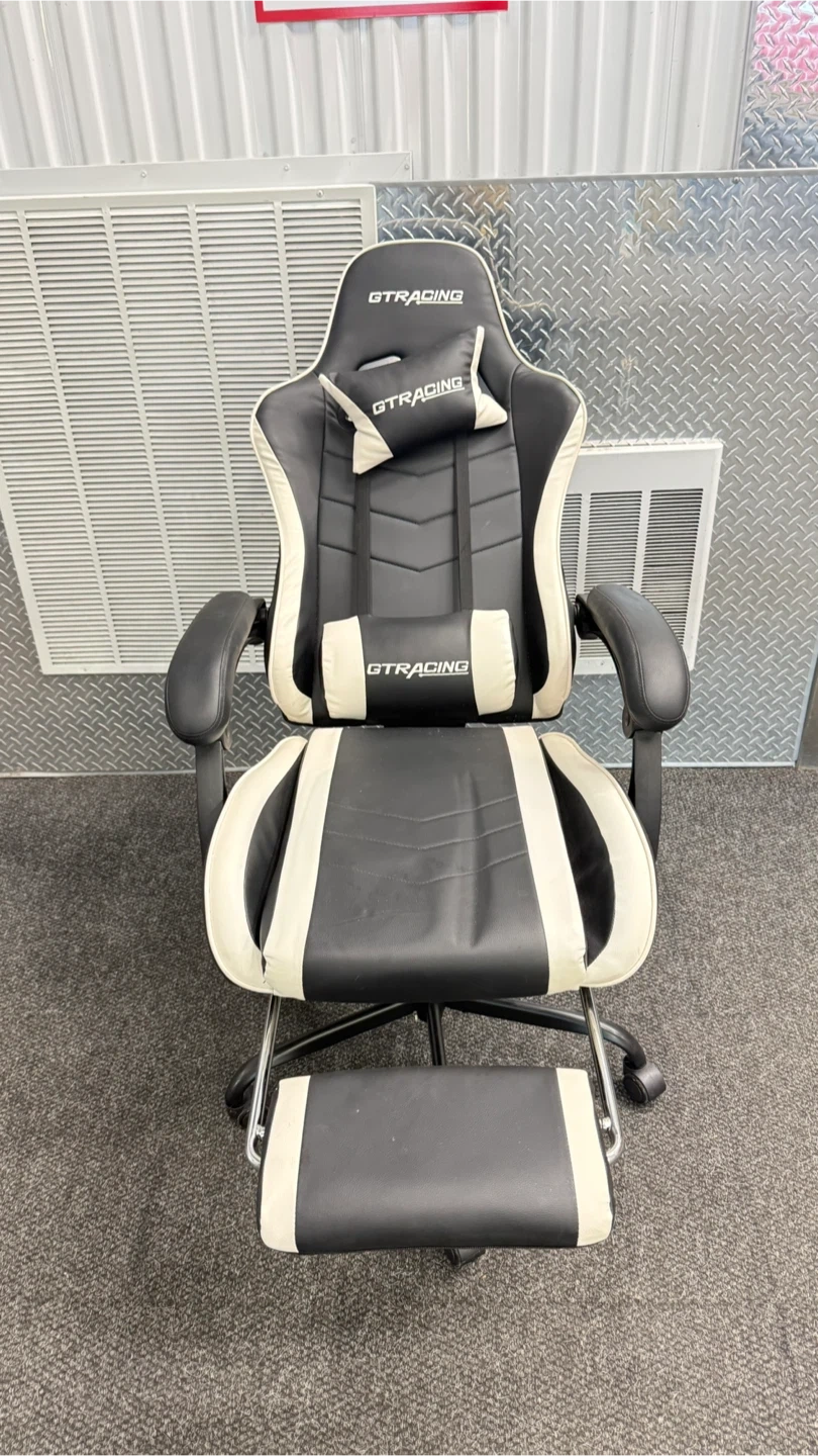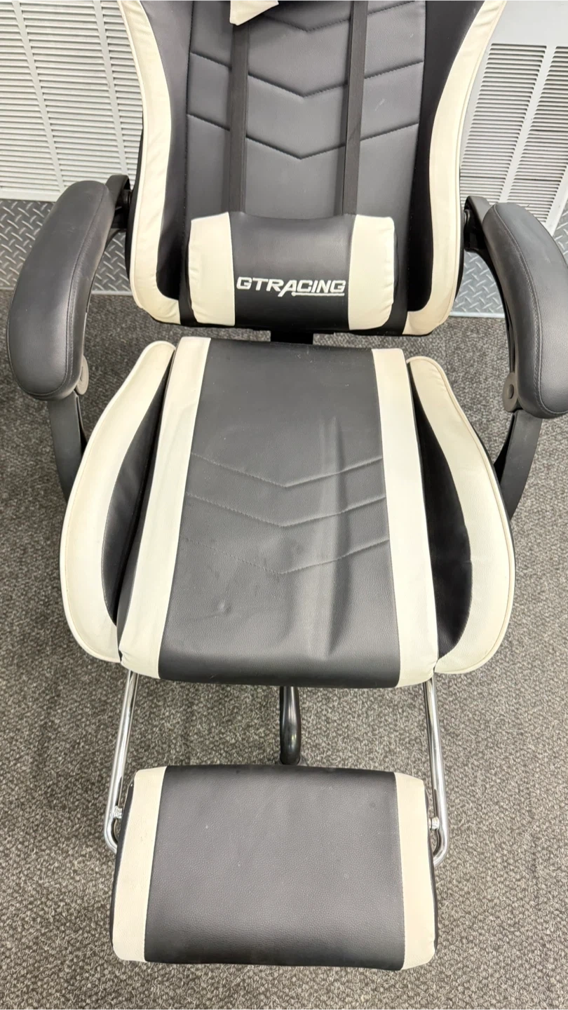 This GTRACING gaming chair is upholstered in black and white faux leather. It's designed for comfort during long gaming sessions. The chair includes a retractable footrest for added relaxation.