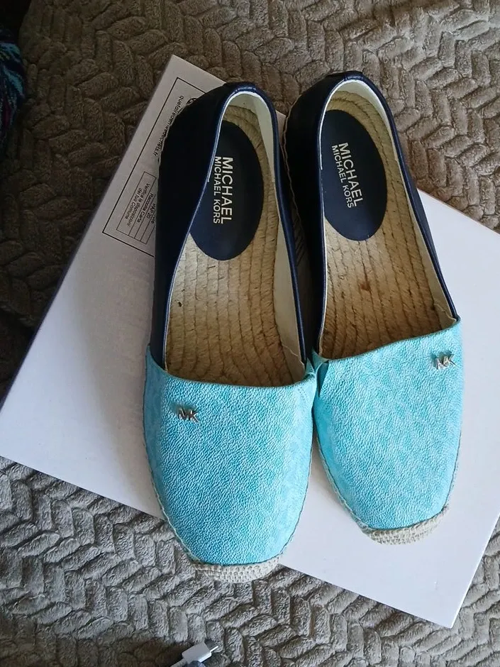 These Michael Kors espadrille flats are a stylish addition to any wardrobe! They feature a beautiful blue suede-like material on the front and a classic espadrille sole. Size 8.5