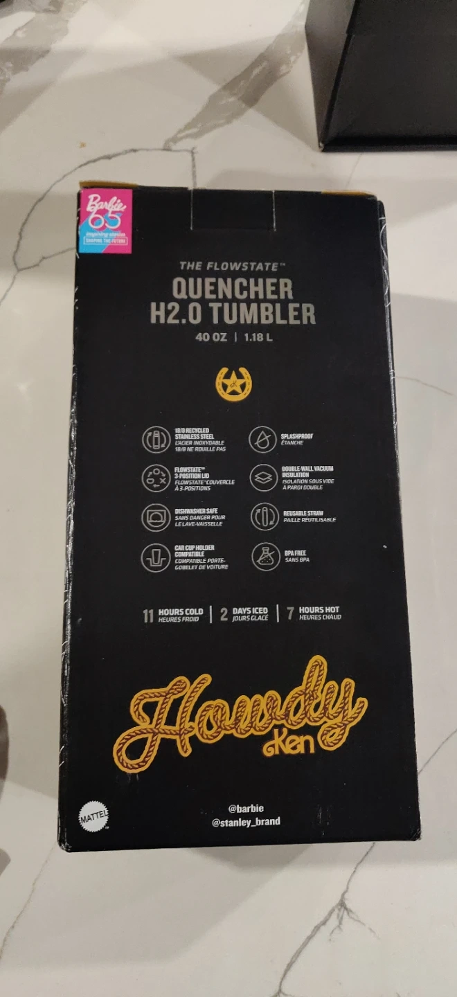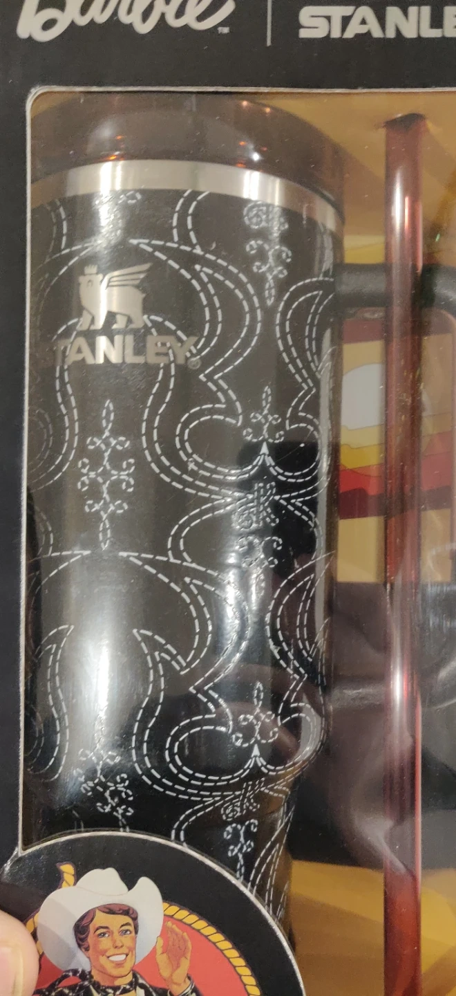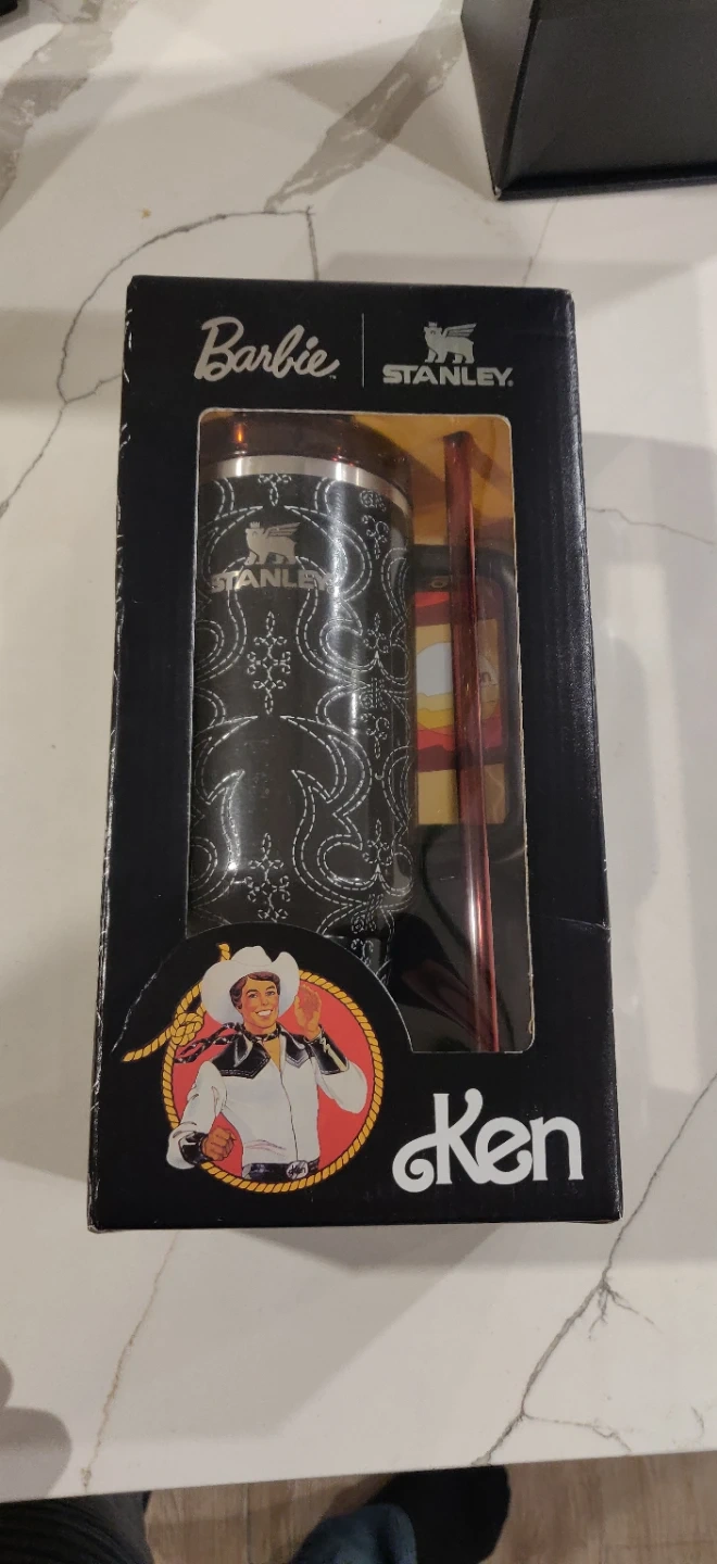 This is the Limited Stanley Barbie Ken Flowstate Quencher H2.0 Tumbler. It's a 40 oz tumbler with a cowboy pattern. Includes a reusable straw. Double-wall vacuum insulation keeps drinks cold for 11 hours and hot for 7 hours.