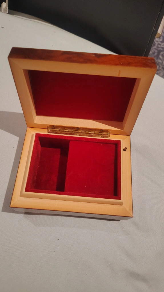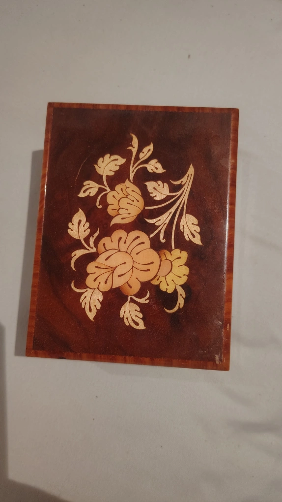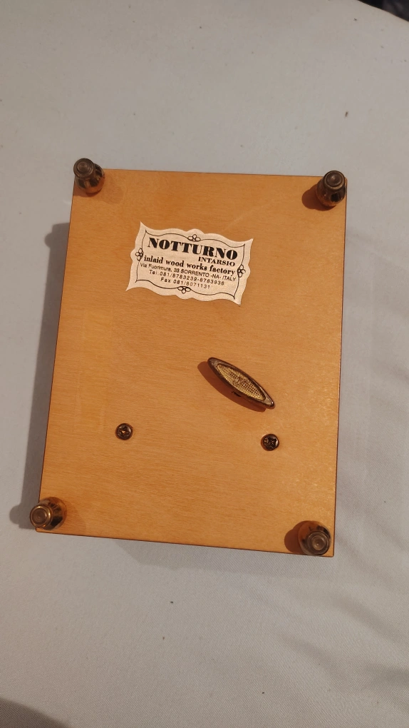 Selling a lovely Notturno inlaid wood music box. It's in great condition and plays beautifully. The interior is lined with red velvet, and the exterior features a floral design. It's a charming piece!