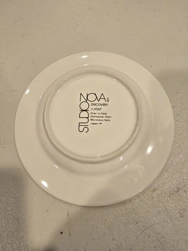 This is a vintage Studio Nova DISCOVERY salad plate in Memphis Style. It measures 6 1/4 inches in diameter and is made of porcelain, bone china, and ceramic. It originates from Japan. Perfect for serving salads or side dishes, this stylish white plate adds a touch of elegance to any table setting.