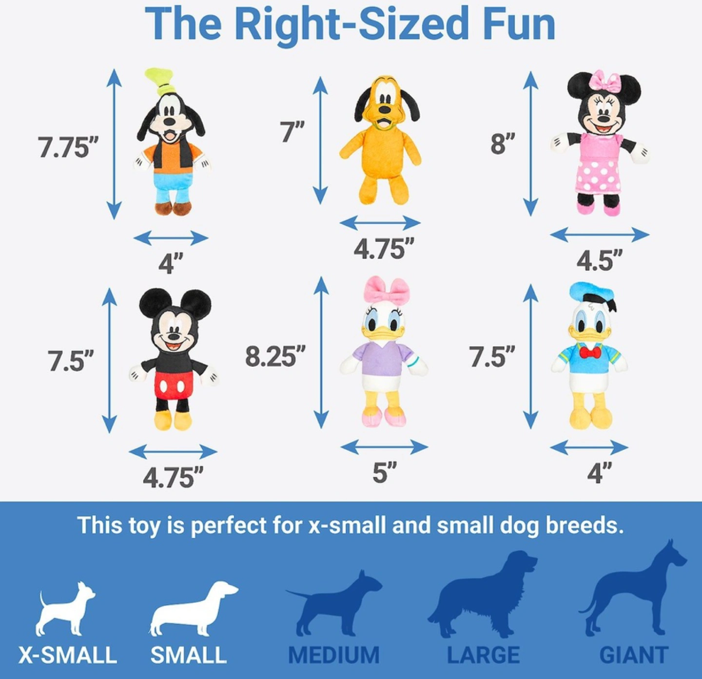 Adorable plush dog toys for small dogs. featuring Mickey Mouse, Minnie Mouse, Goofy, Pluto, Daisy Duck, and Donald Duck. Small size, perfect for small dogs.
