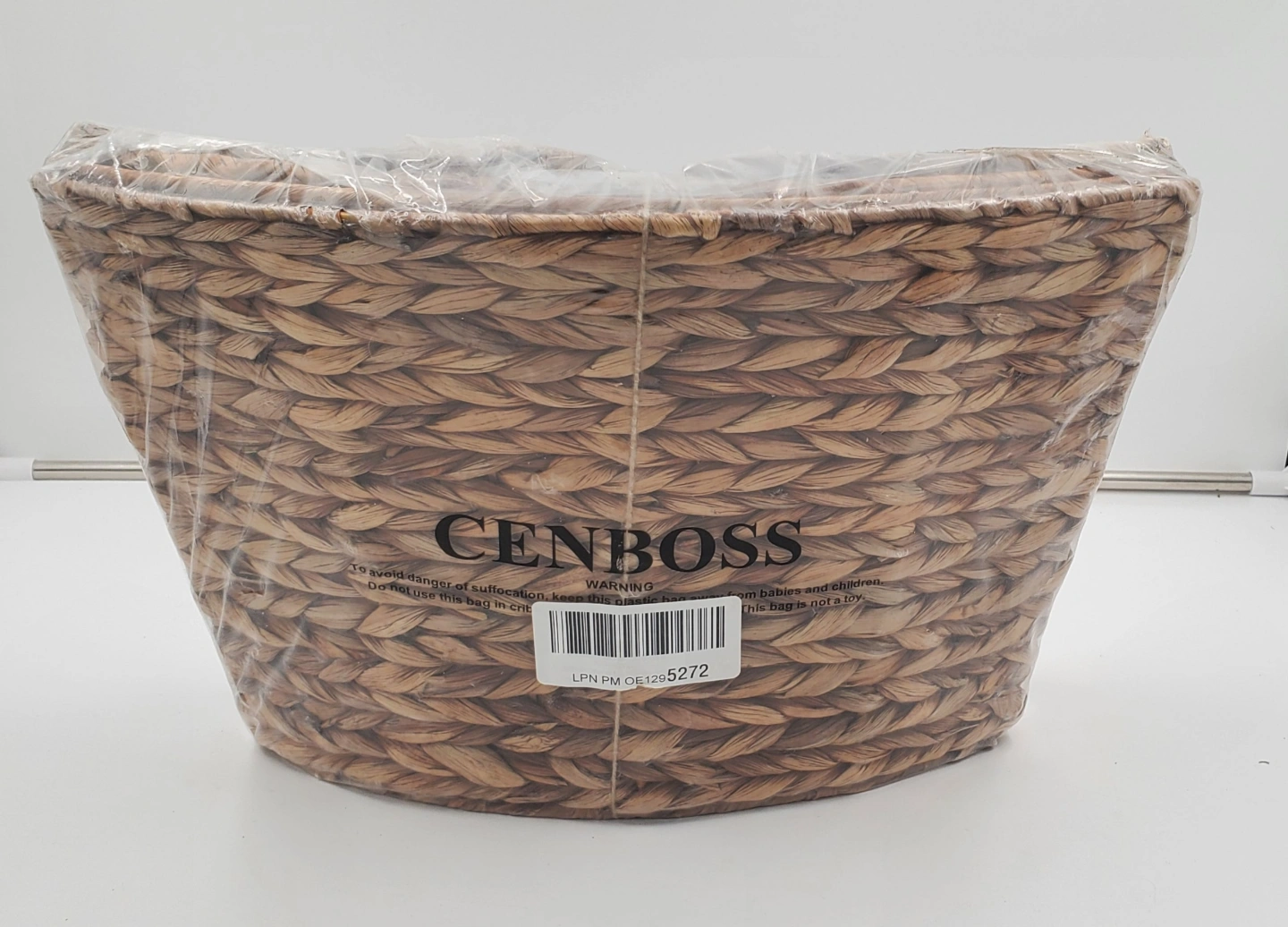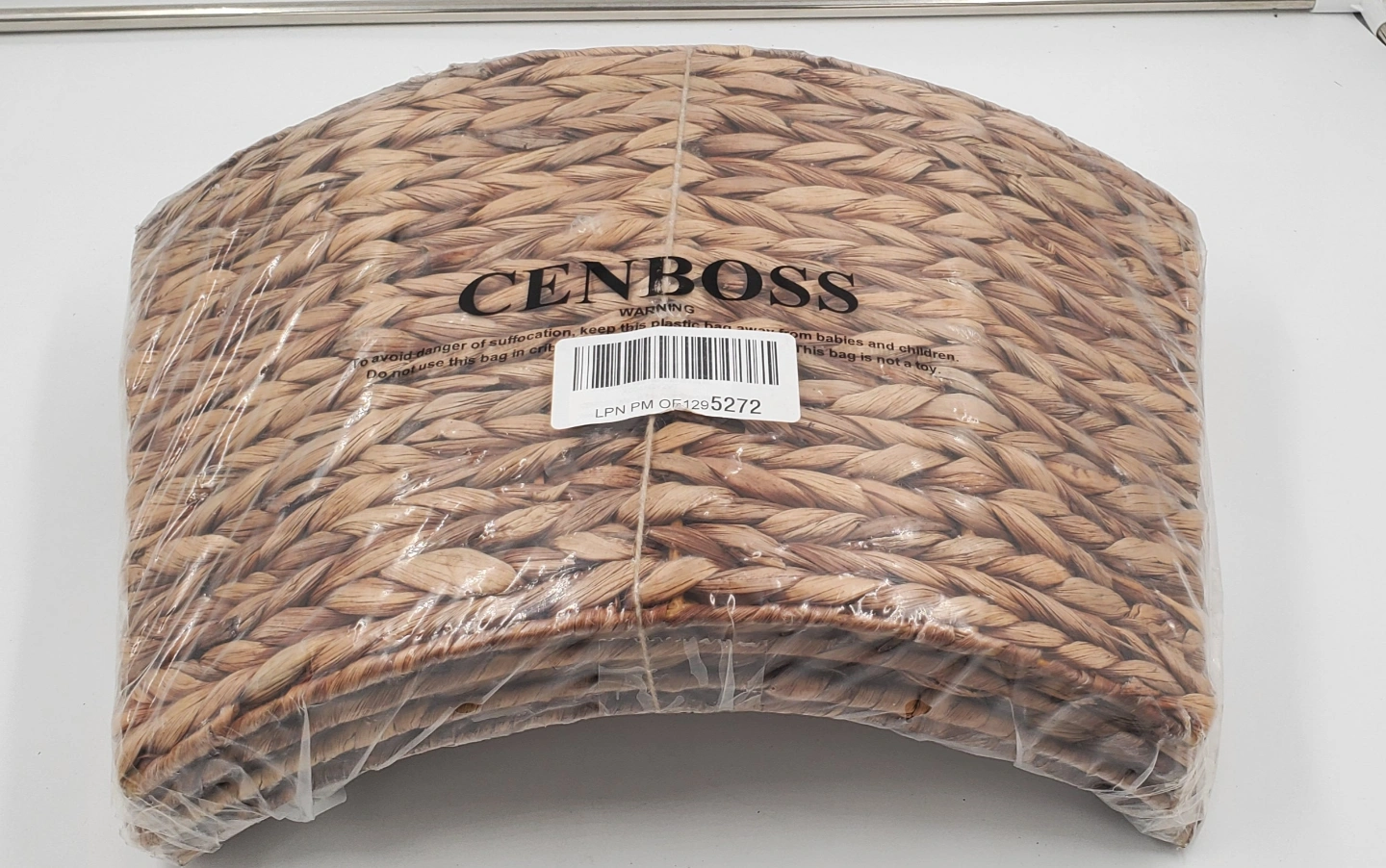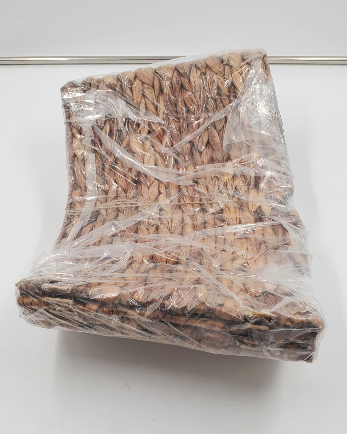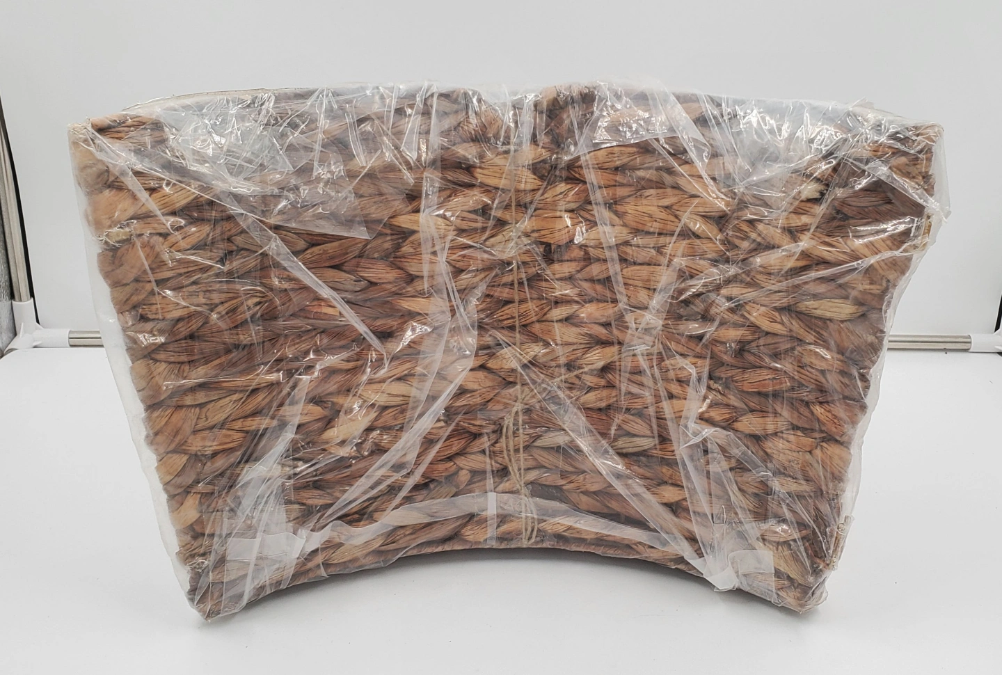 Brand new, never used. Fits trees 4-7ft tall. Measures 24" diameter, 10" high. Water hyacinth material. Easy assembly.