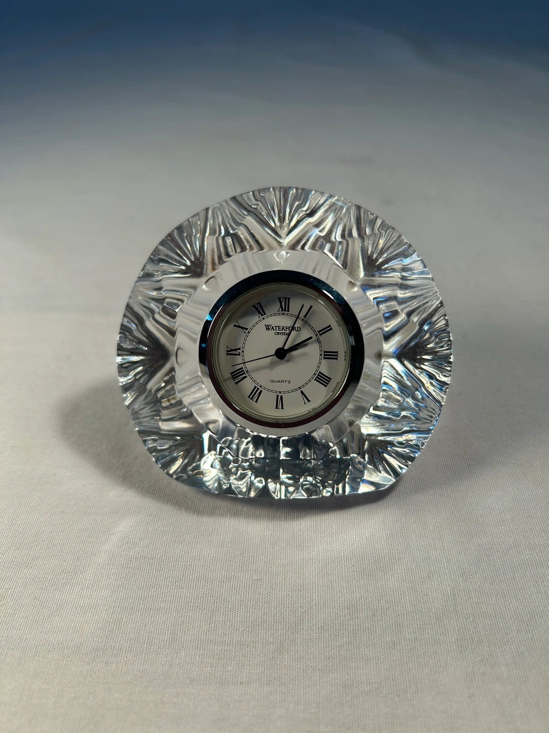 Classic Waterford Lismore Diamond desk clock. New costs $235. Quartz clock works, new battery. Cut crystal star design. Wedding, congrats or 15th anniversary gift.