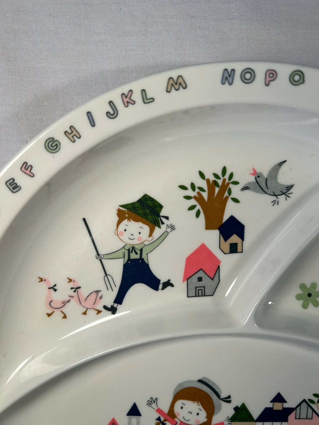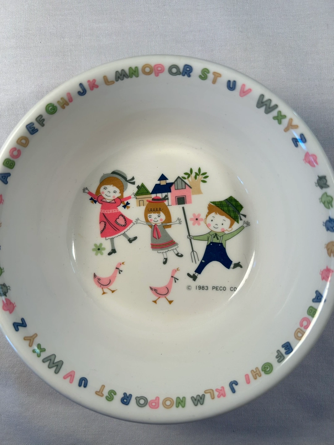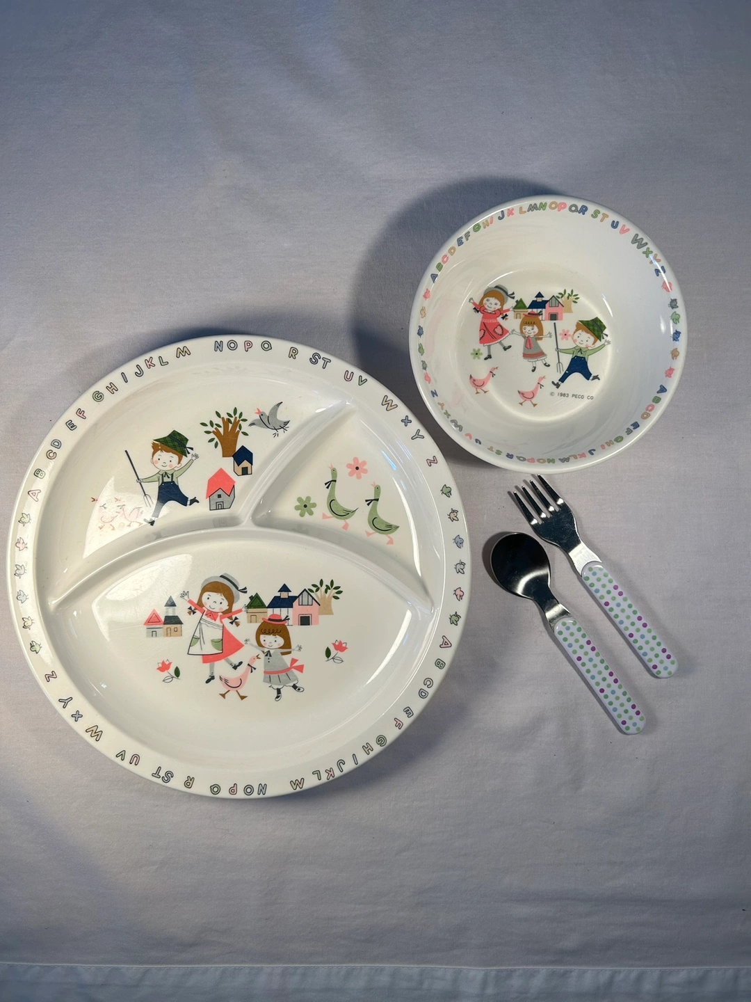 Adorable retro ABCs & farm design. Baby plate and bowl. PECO melamine is food & dishwasher safe, NO microwave. By Sheng & Jiumn. 1983. Fork & spoon included.