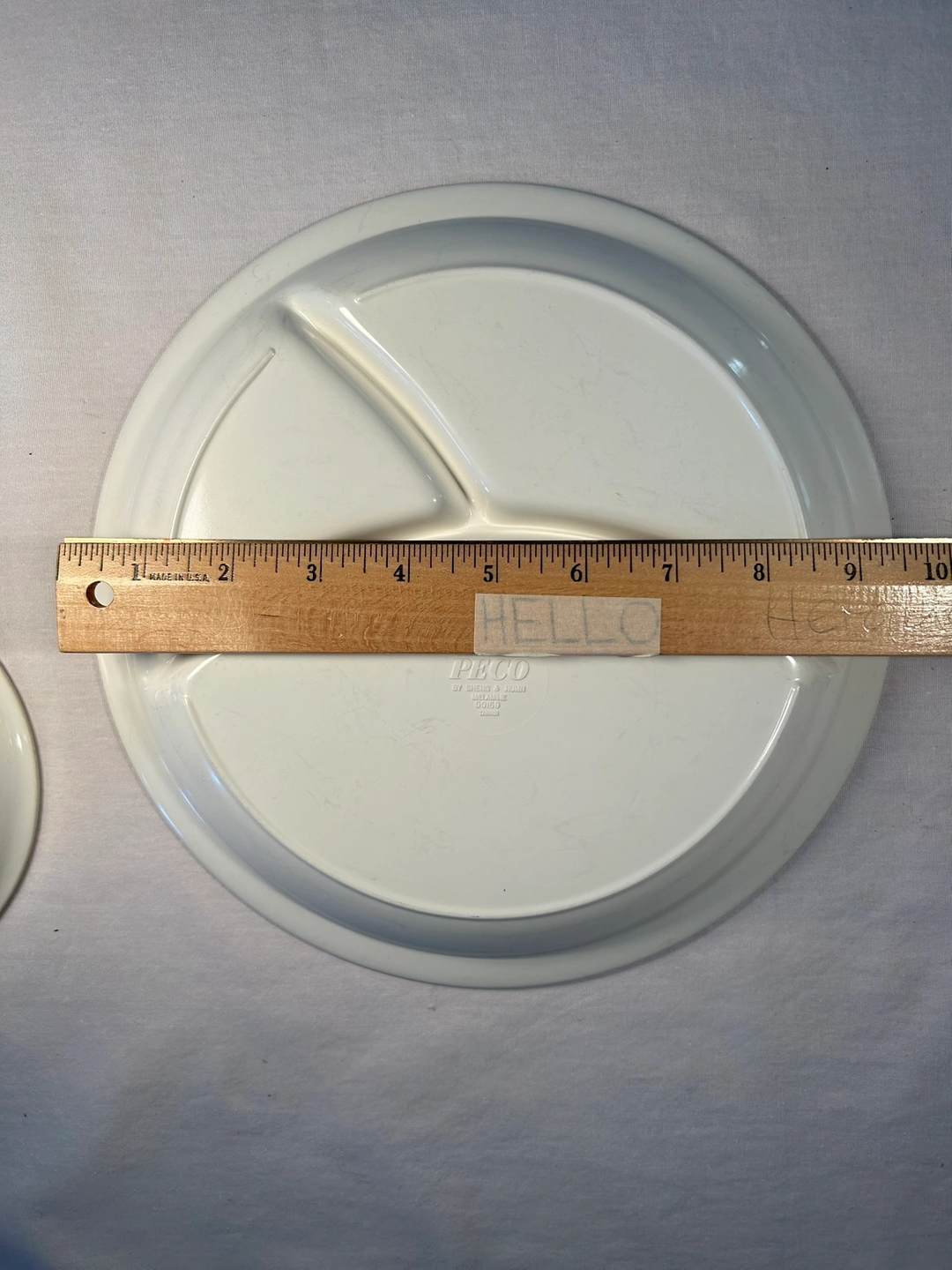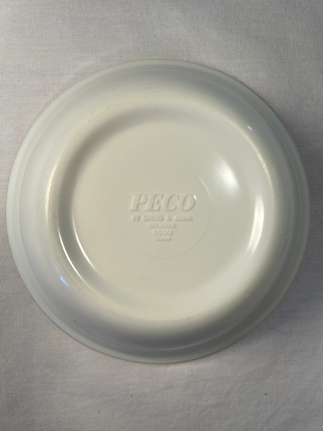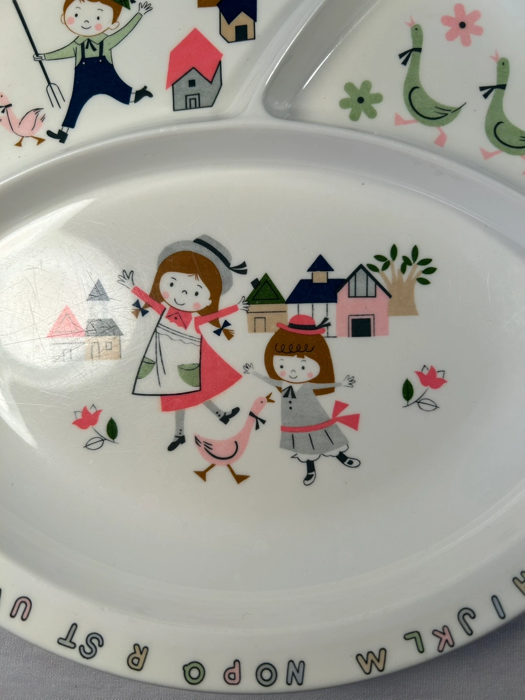 Adorable retro ABCs & farm design. Baby plate and bowl. PECO melamine is food & dishwasher safe, NO microwave. By Sheng & Jiumn. 1983. Fork & spoon included.