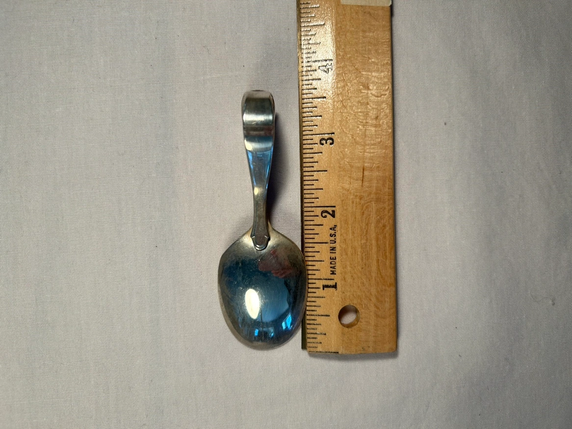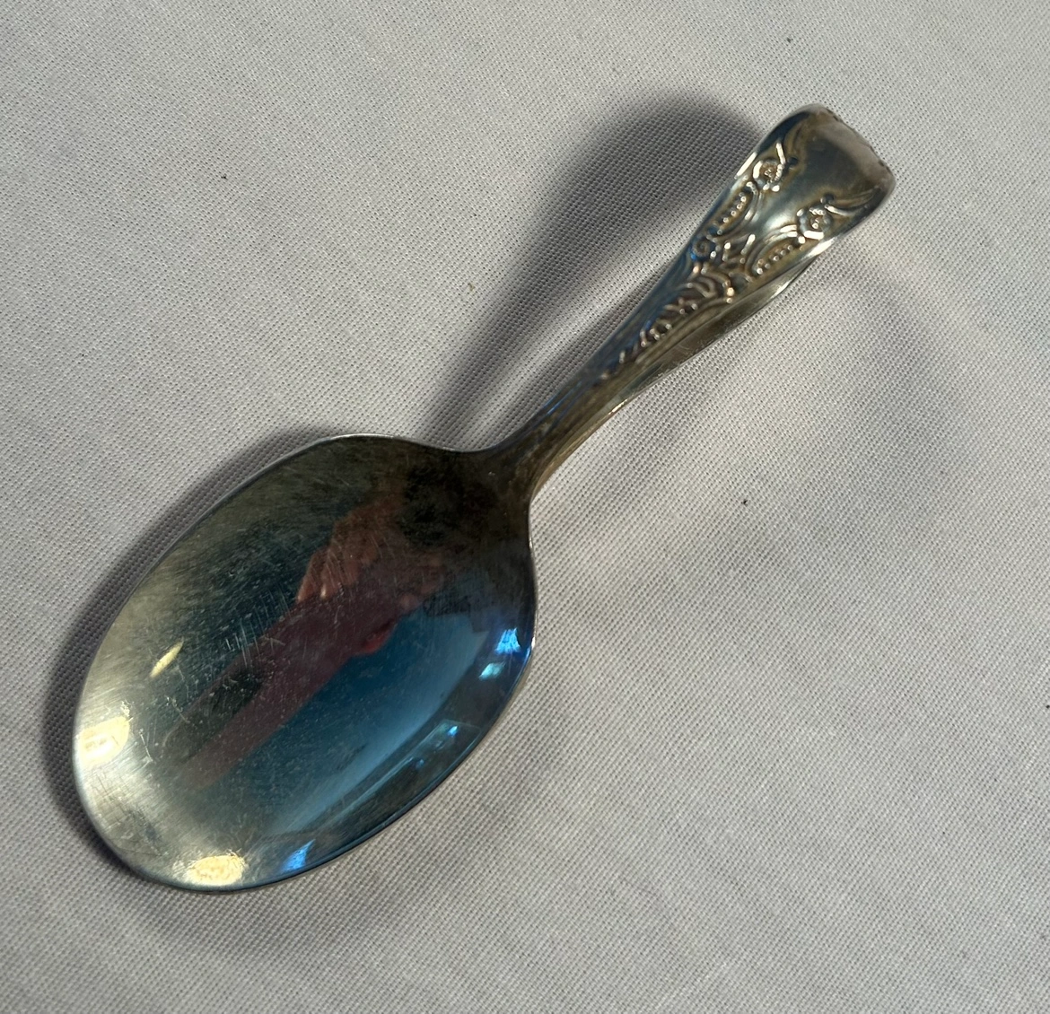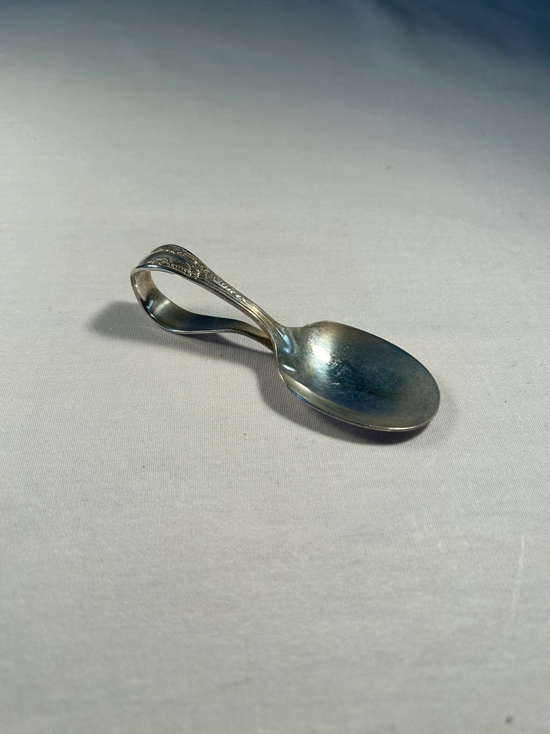Sterling, baby spoon. 1980. Floral design on curved “thumb” handle. Wonderful, traditional baby shower or christening baptism gift. New is $100+.