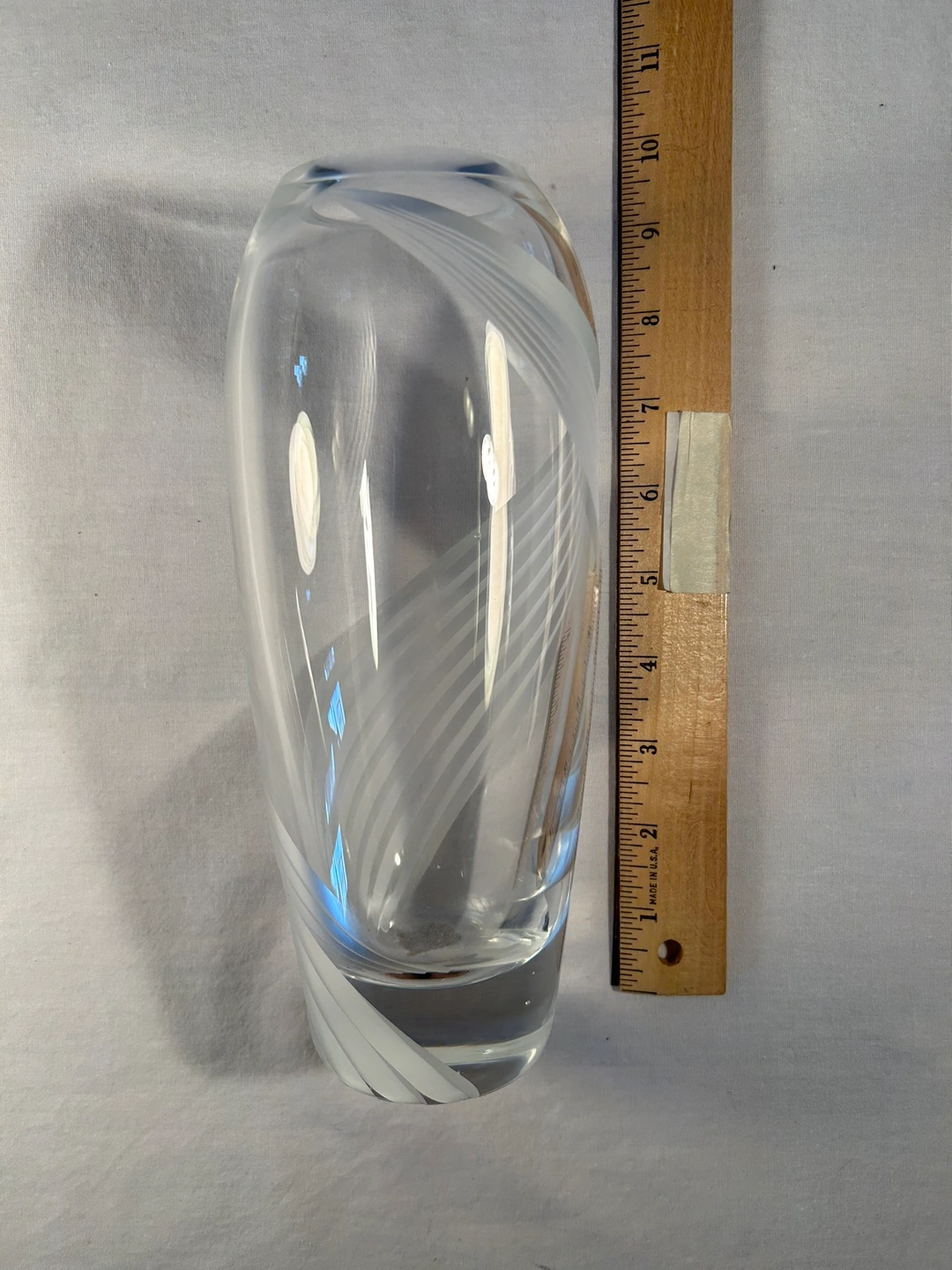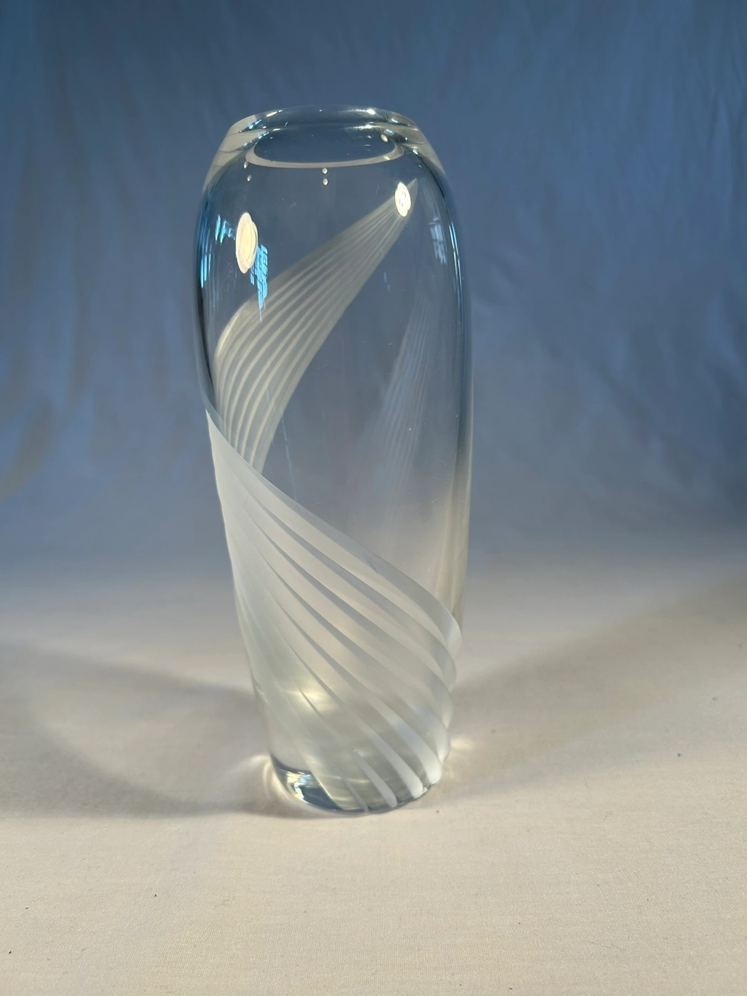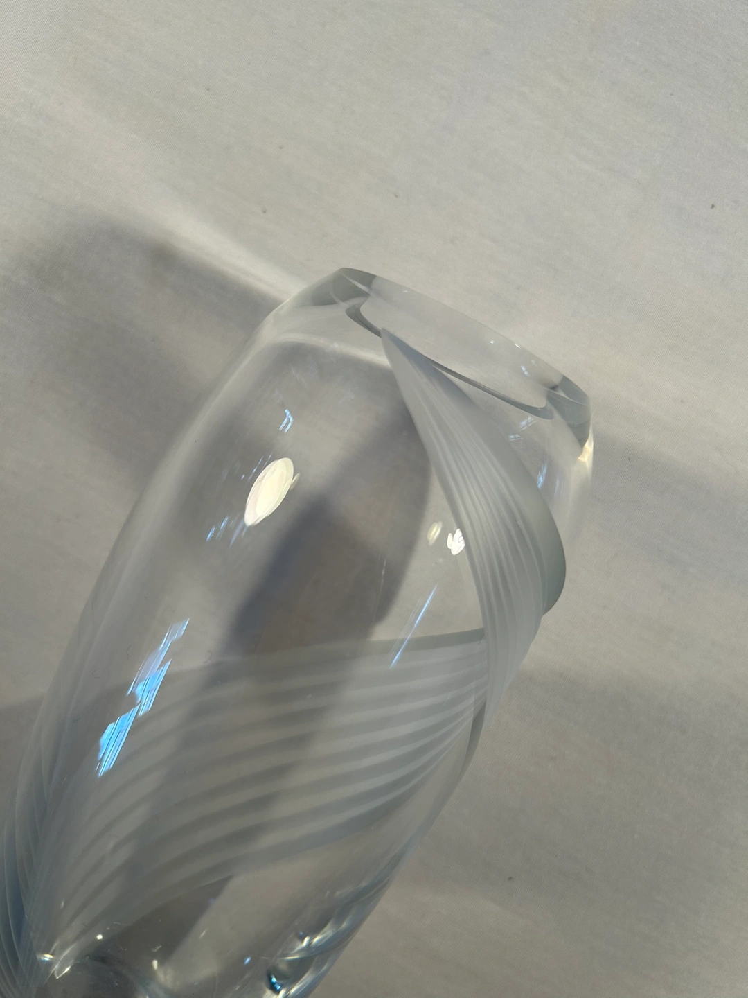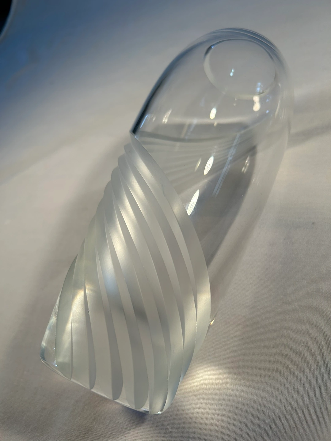Vintage 1980. Contemporary etched / frosted swirl from top to bottom. Heavy crystal - 3/8” thick. Wedding, bridal shower, 3rd or 15th anniversary, house warming gift. Sophisticated flower vase.