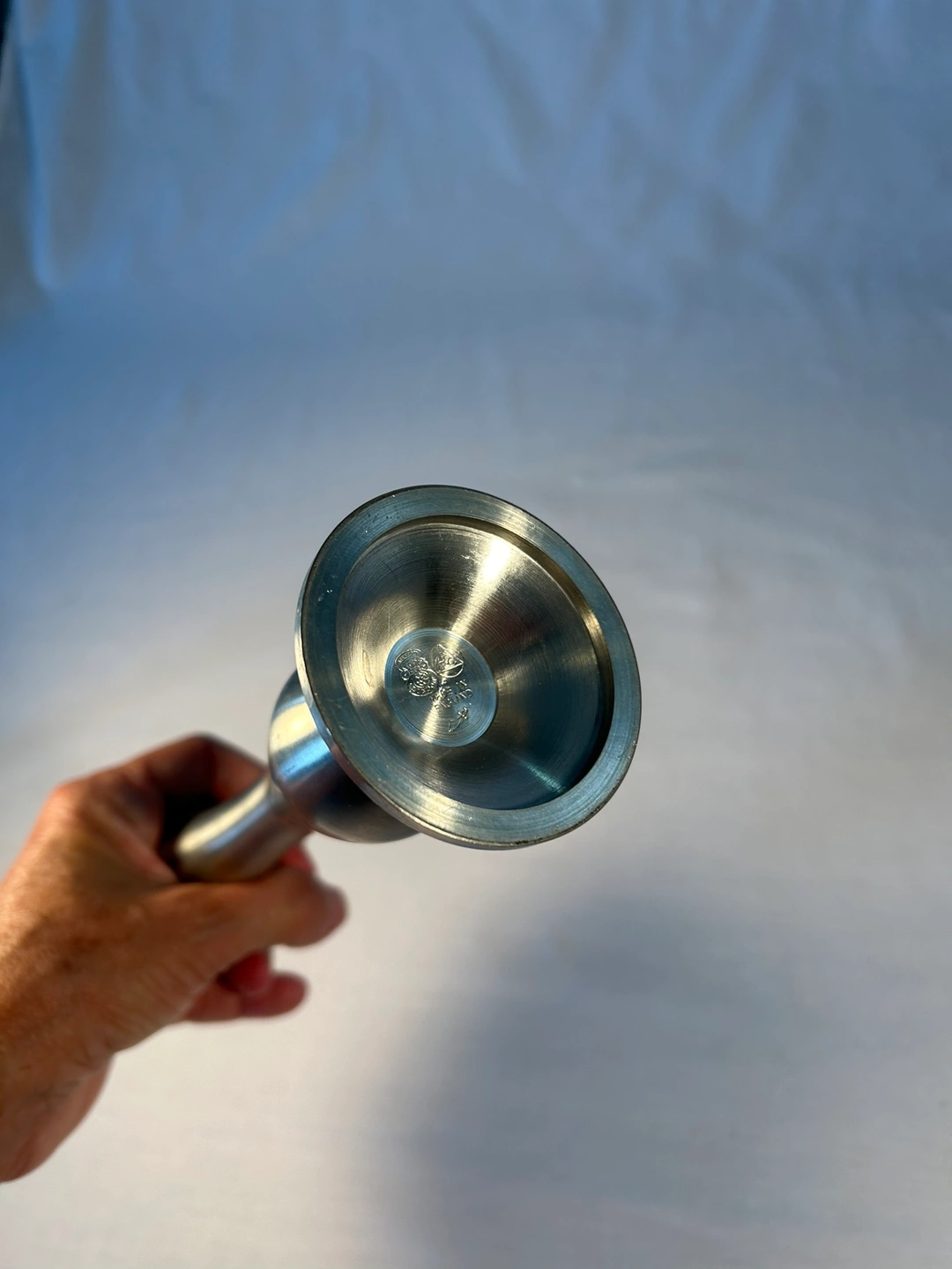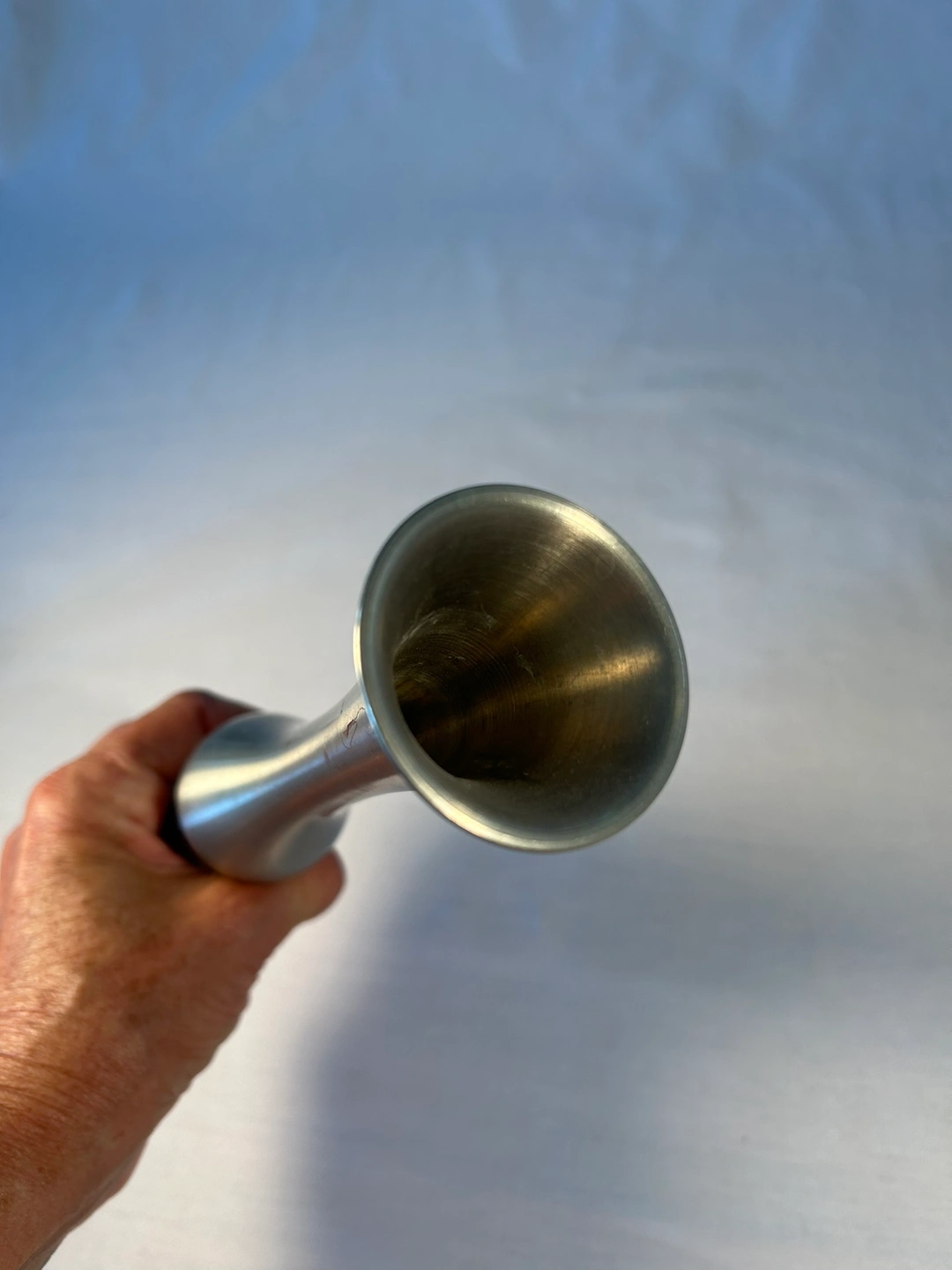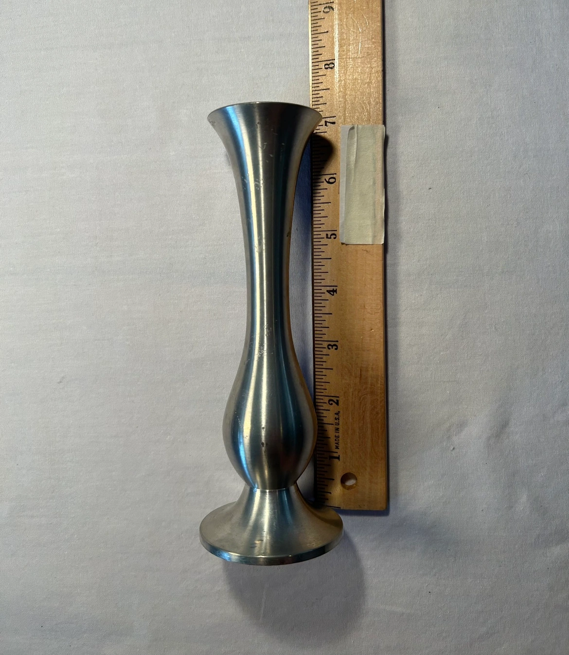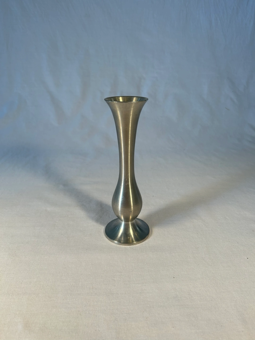 Vintage bud vase. Graceful curves throughout. High end English pewter which is considered the best available. Made in London - by Crown & Rose / Englefields Ltd. Stamps include Assn of British Pewter Craftsmen circa 1970.