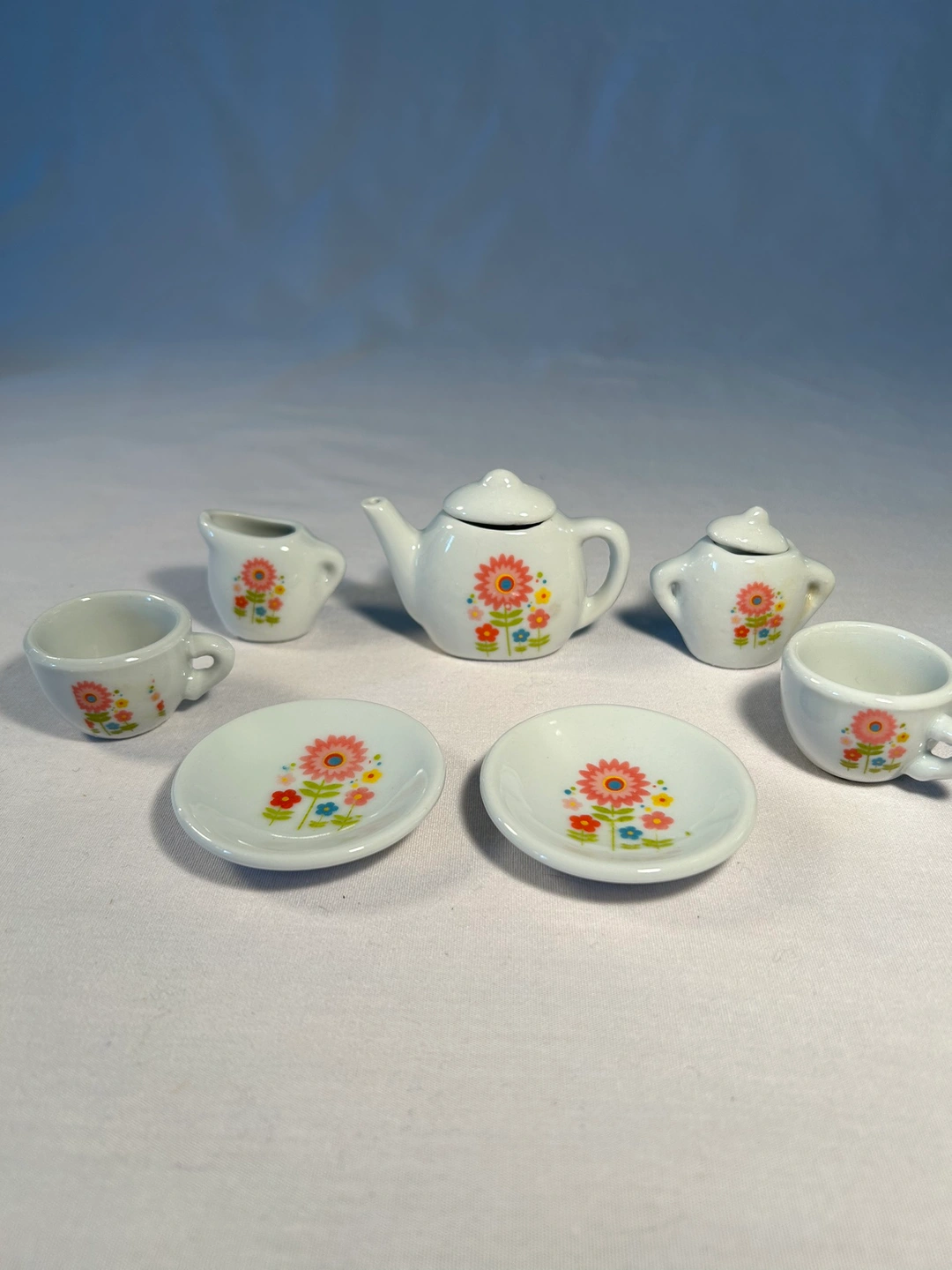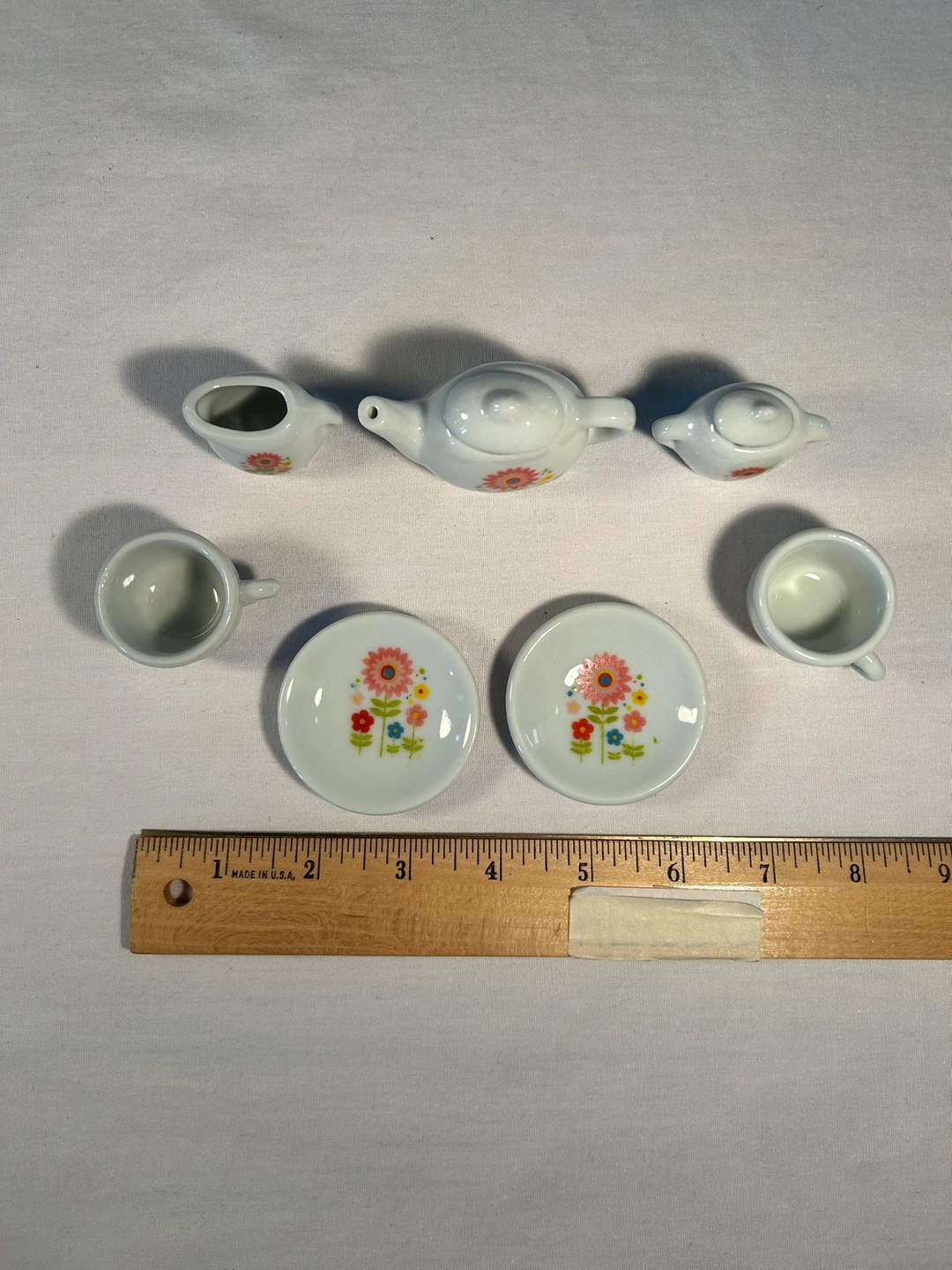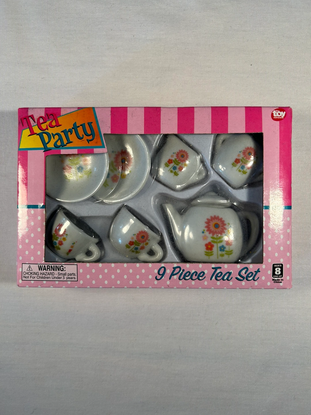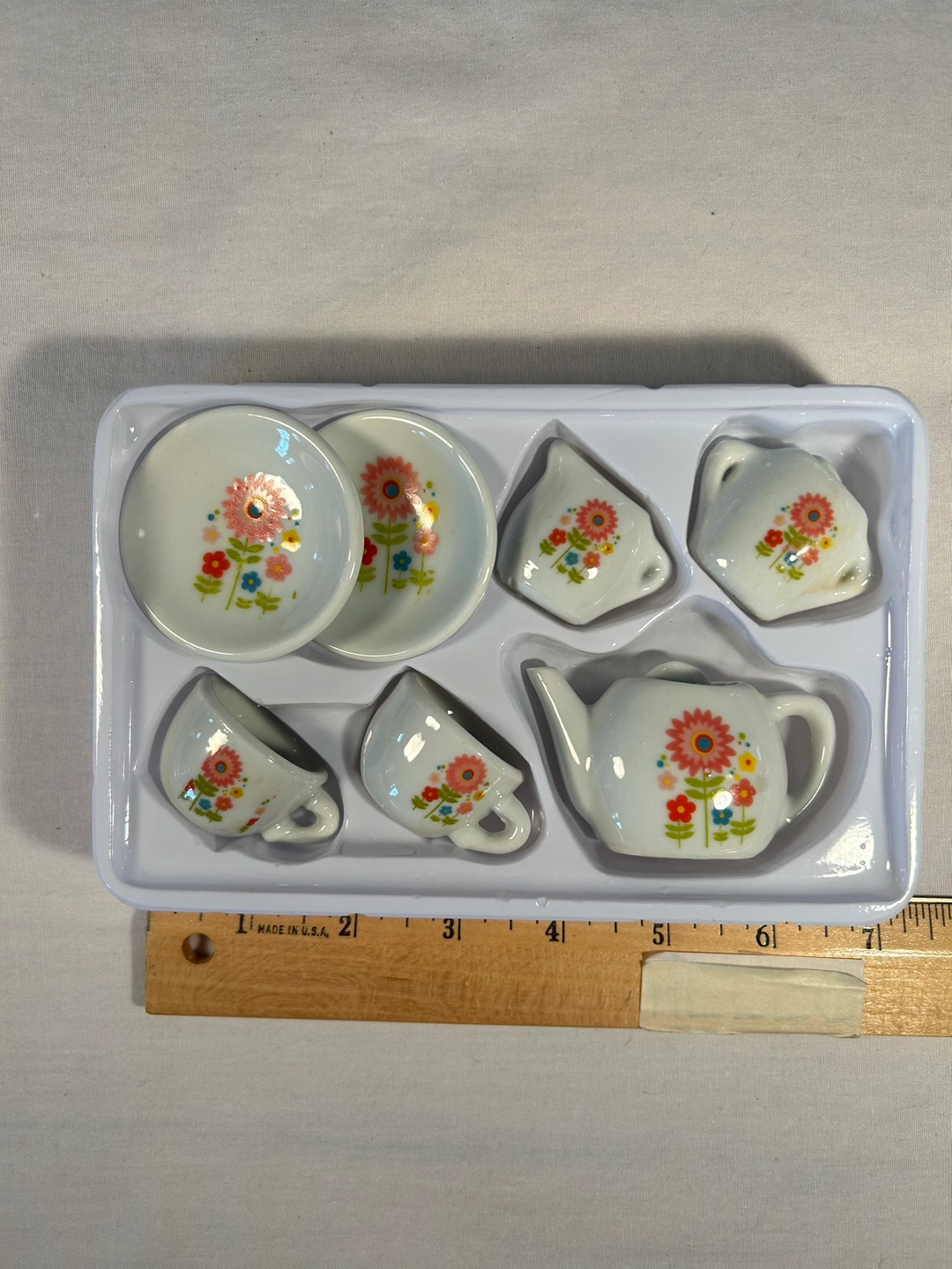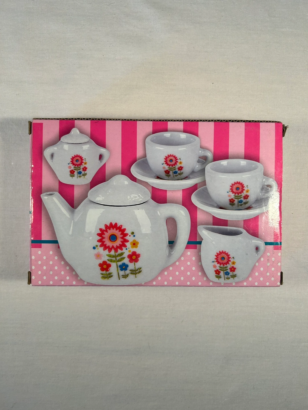 Sooooo pretty and tiny. Hand painted pink, blue, yellow flower design. Brand new play make believe tea set. Never used, in orig intact box which considers the little lids as 2 “pieces” ;) Currently $13 on Amazon.
