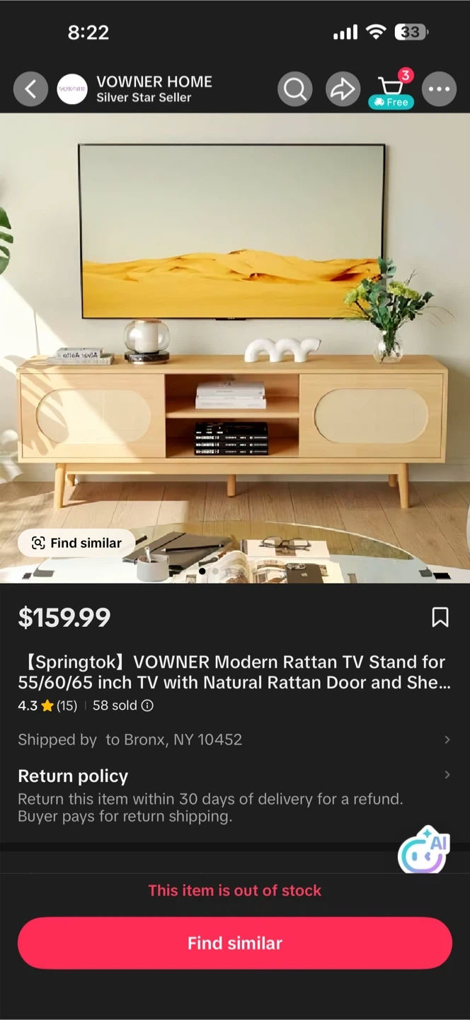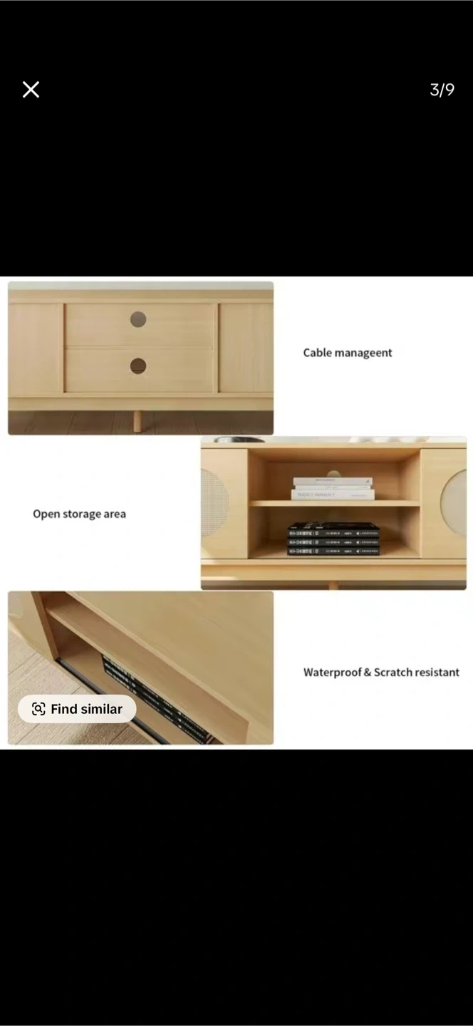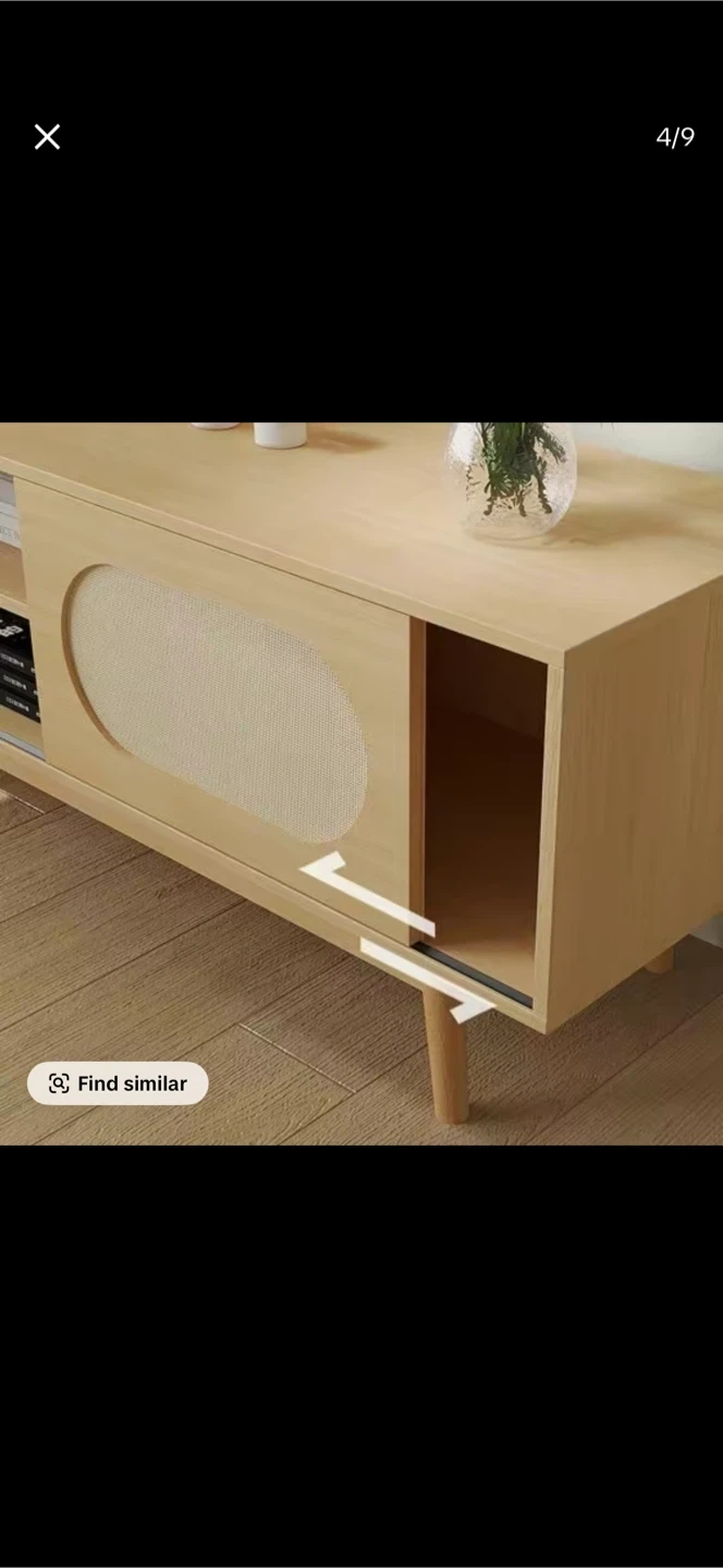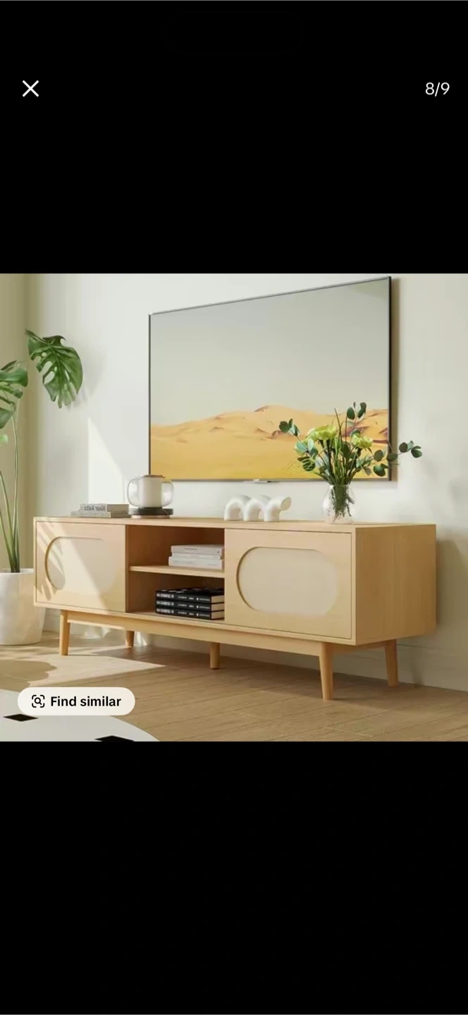 A modern light wood TV stand featuring rattan inlay doors and an open storage area. It's waterproof and scratch-resistant, offering cable management for a tidy setup. Dimensions: 150cm wide, 33cm high, 40cm deep. New I buy for mi living room , but don’t fit.