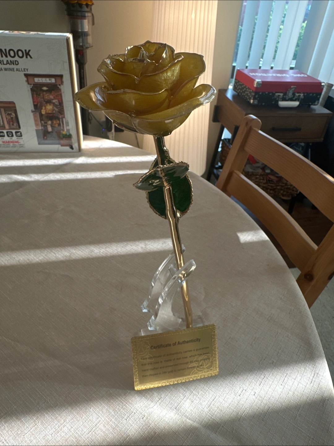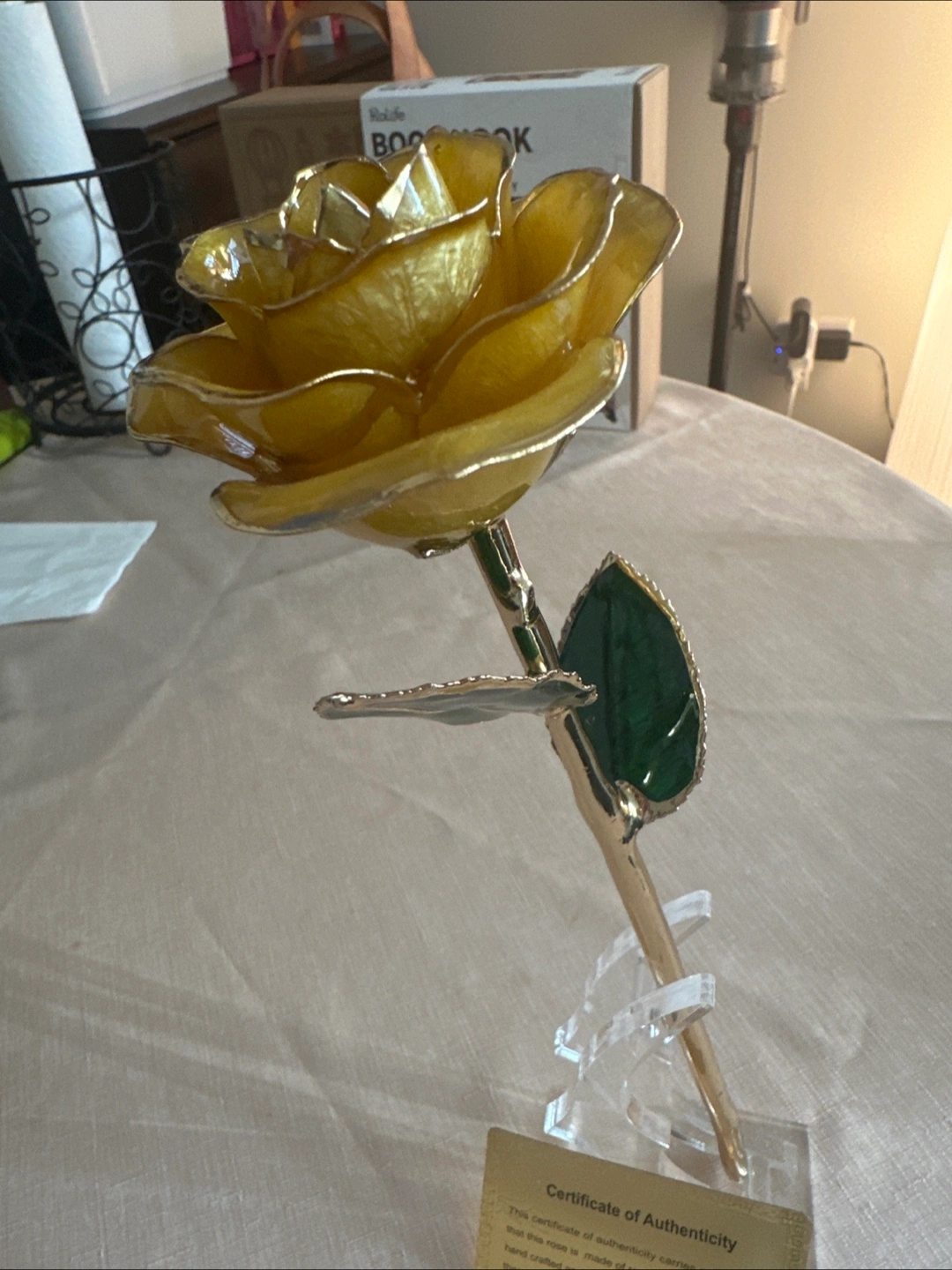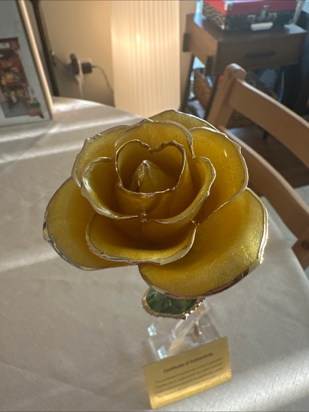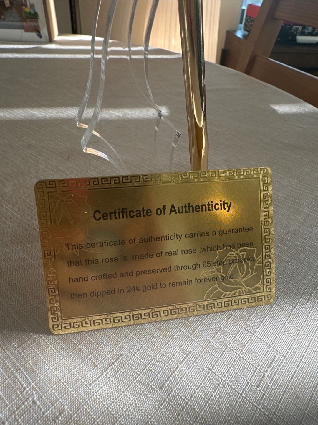 Selling a beautiful 24K gold dipped real rose. It comes with a certificate of authenticity, guaranteeing that the rose is made of a real rose, which has been hand-crafted and preserved through a 65-step process, then dipped in 24k gold to remain forever gold