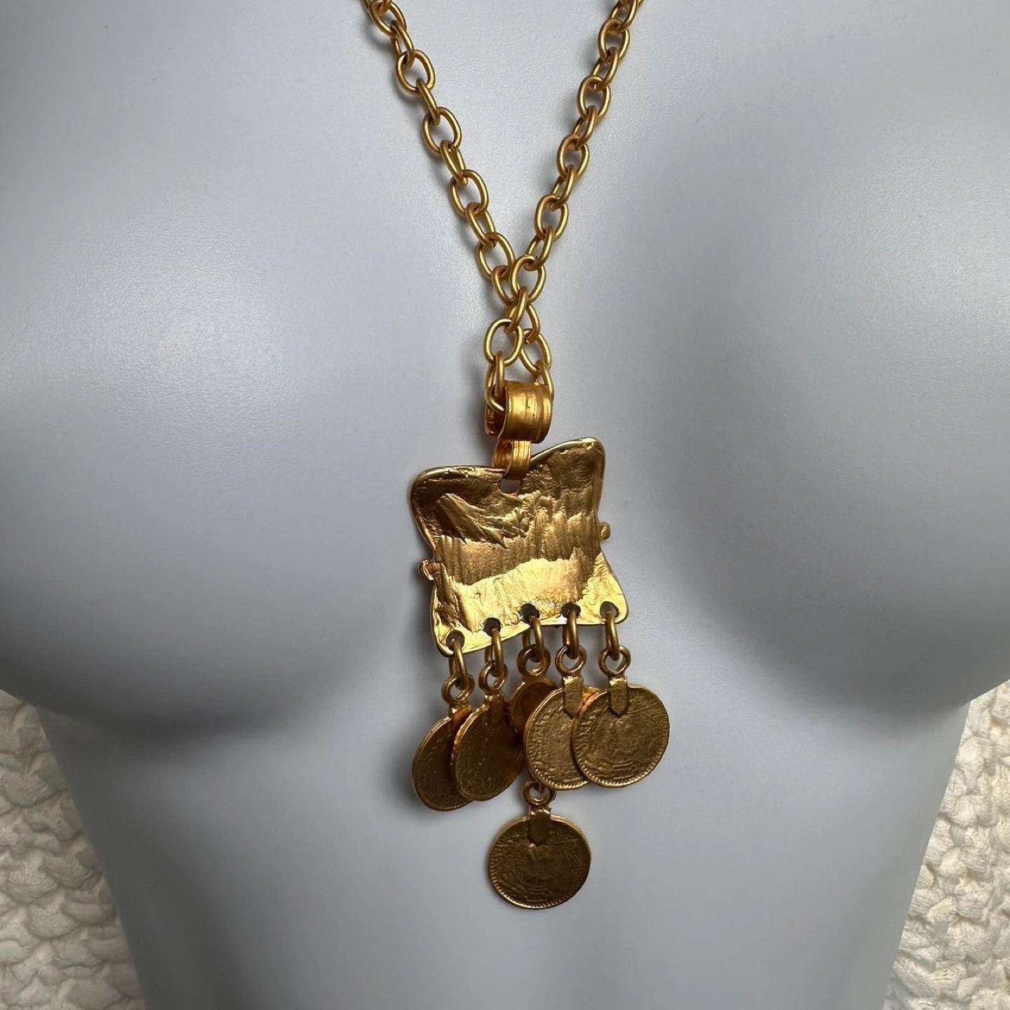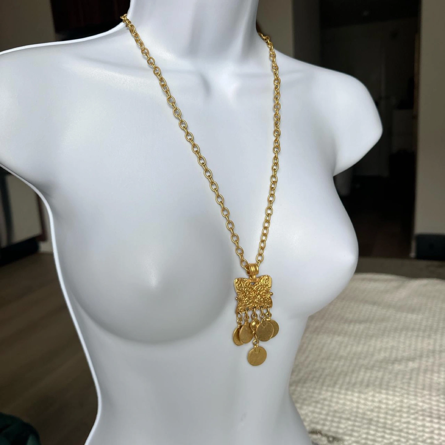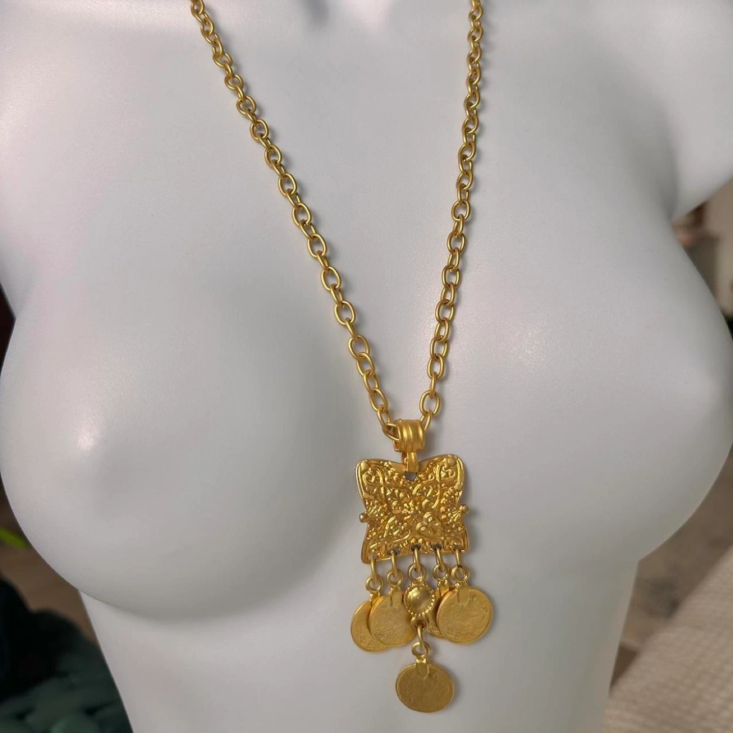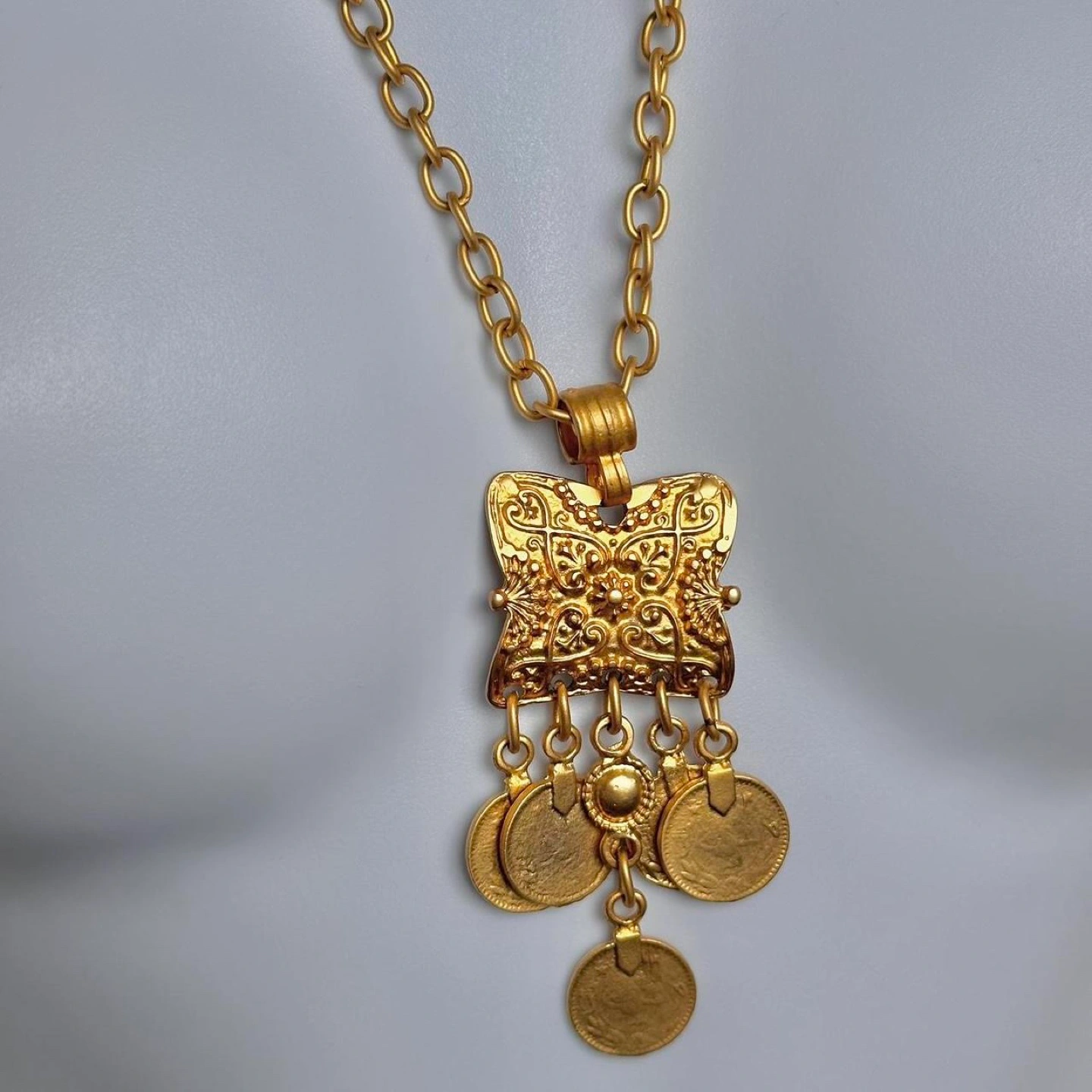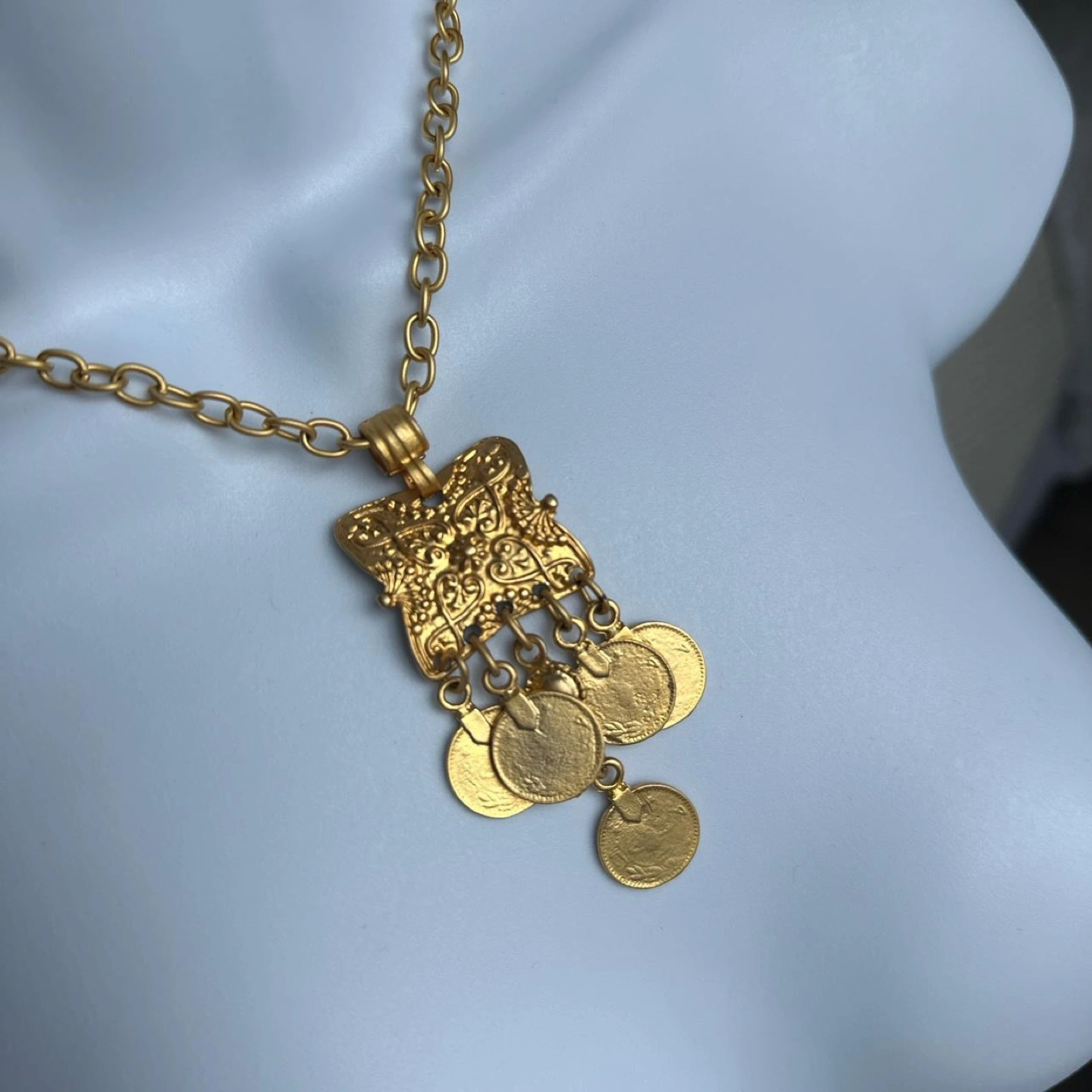 24k gold plated turkish coin necklace. Handmade in Turkey. Flaws are natural since this is handmade and is one of a kind.