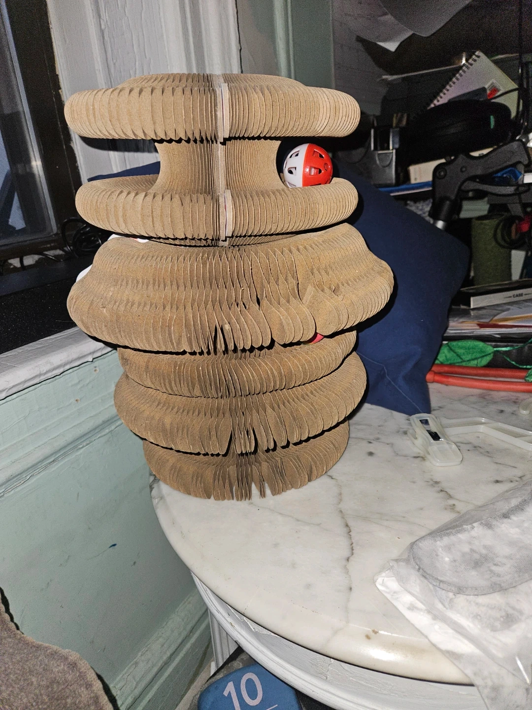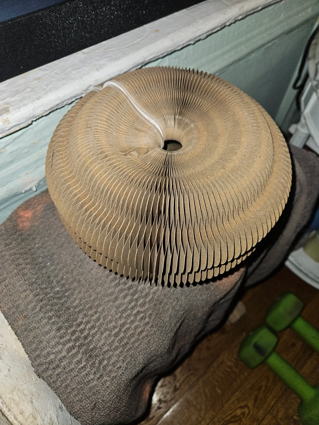 3 accordion-style cardboard cat scratcher offers a unique and engaging way for your feline friend to scratch and play. It's made from durable corrugated cardboard and includes a few small balls for added entertainment. Its expandable design allows for various configurations to suit your cat's preferences. Youre able to attach 2 or all 3 together with magnetic clasps. PICKUP ONLY.